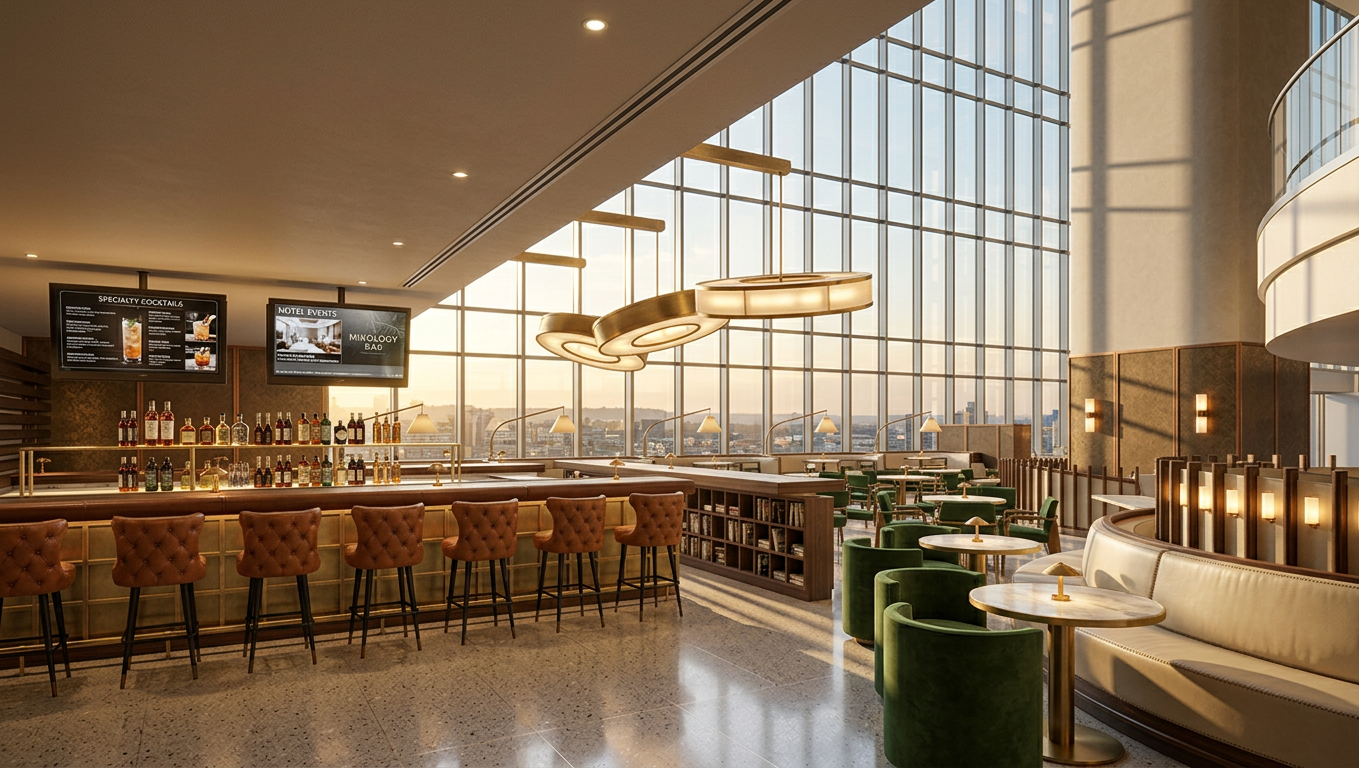 john portman style hotel lobby bar back wall to be fluted concrete with wood fins bar top and squares under bar to be white concrete light fixtures over bar to be made of glowing paper maintain design architecture and proportions of input image