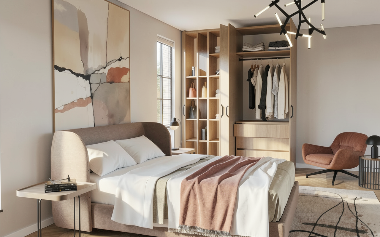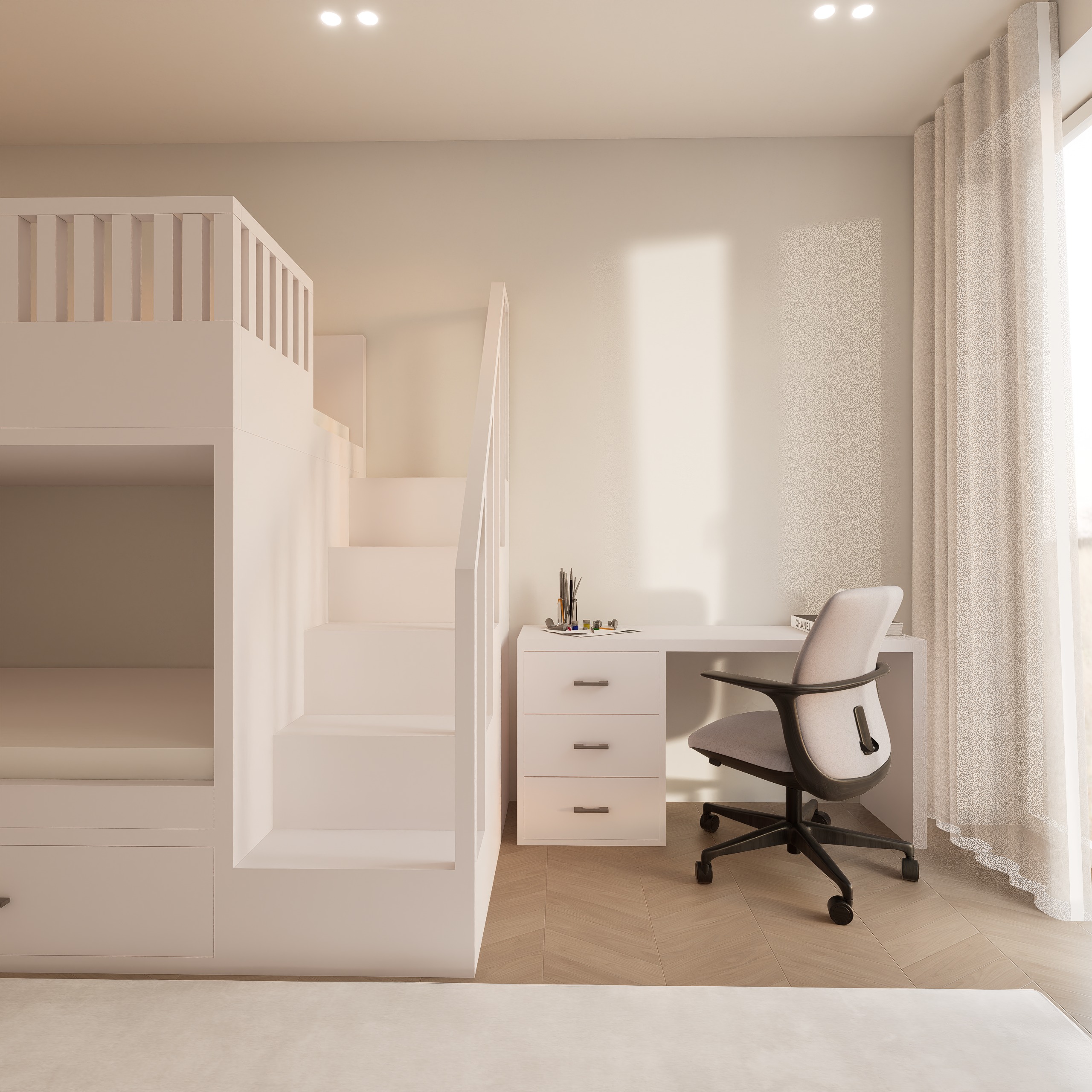 ultra realistic interior render keep exact same design layout proportions and camera angle do not change any geometry furniture placement framing or perspective do not move the camera materials bunk bed in matte painted wood off white with subtle surface texture and soft edge definition mattress and cushions in soft fabric with visible textile grain and natural compression desk and drawers in matte lacquer finish with soft reflections and slight tonal variation chair with fabric upholstery and matte plastic metal base with realistic material separation walls in warm beige matte paint with subtle micro texture curtains in light linen fabric semi transparent with natural light diffusion floor in natural oak wood with visible grain and tonal variation lighting strong natural daylight entering from the right side casting soft directional shadows slightly overexposed window light for realism warm ceiling spotlights 3000k with soft falloff introduce shadow depth under the bunk bed and stairs soft uneven light gradient on wall avoid perfectly clean highlight environment minimal but realistic slight imperfections in fabrics and materials desk objects natural and not perfectly aligned style ultra photorealistic high end interior photography soft contrast natural imperfections 8k global illumination ray tracing strictly preserve original design no color deviation no perspective change