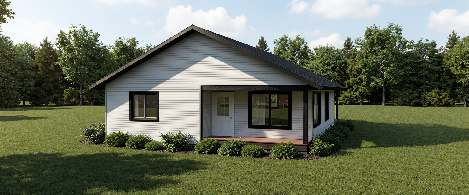 darken the beams and posts add black trim around the windows and doors add black doors add background trees