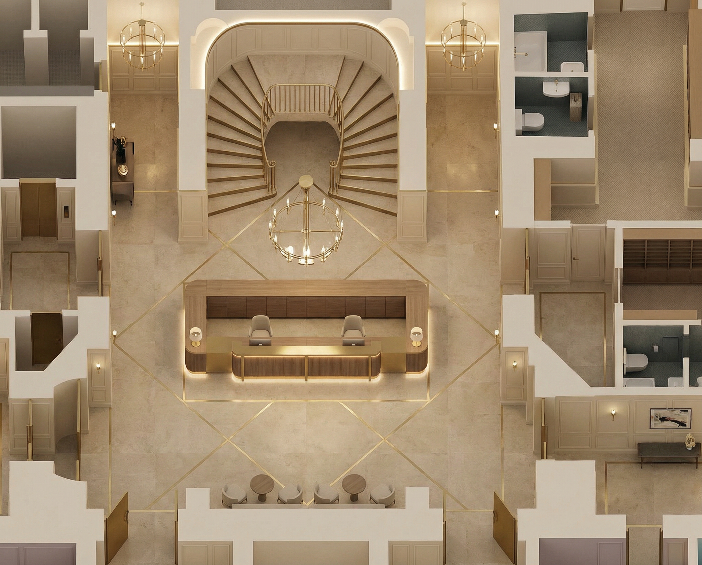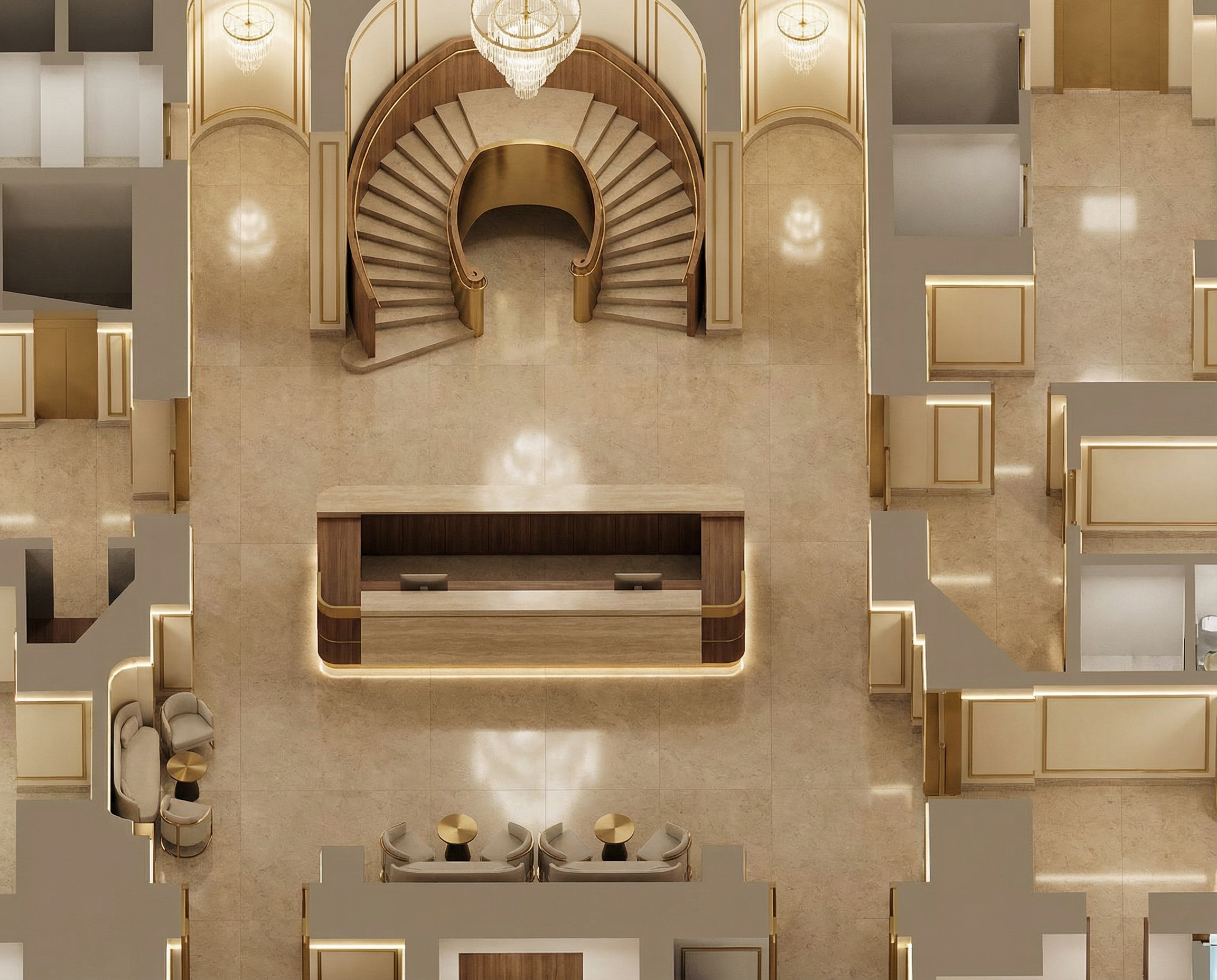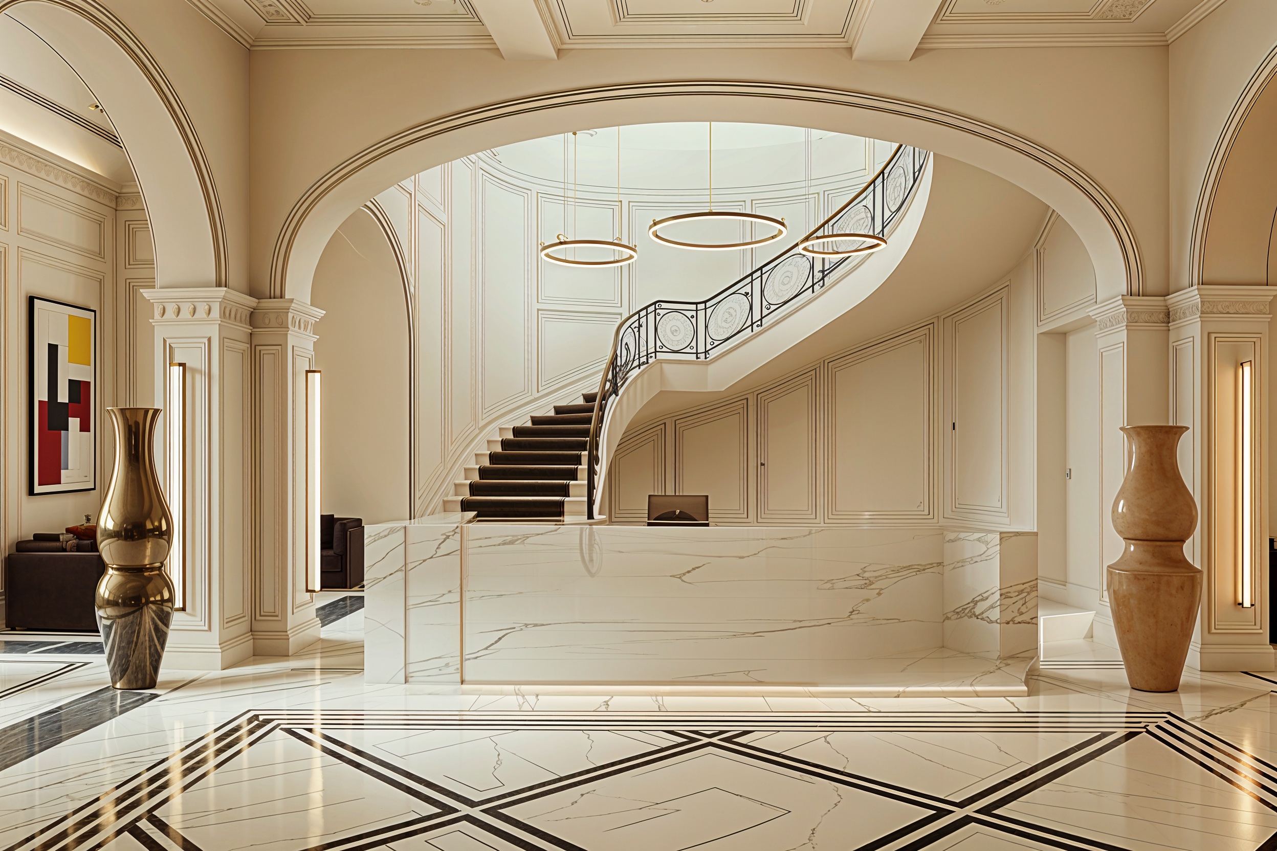 classical interior shot a grand luxurious interior with a central sweeping staircase the floor and reception desk are made of elegant white marble with subtle gray veining large vases in a reflective bronze finish are placed strategically adding sophistication walls and ceiling are adorned with intricate pastel cream paneling and detailed molding ambient warm lighting emanates from modern golden circular chandeliers and vertical wall lights casting a soft glow the atmosphere is opulent and inviting evoking a sense of timeless elegance and grandeur architecture