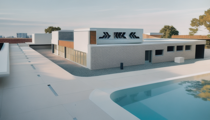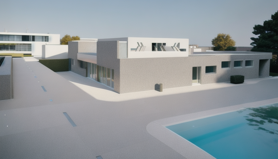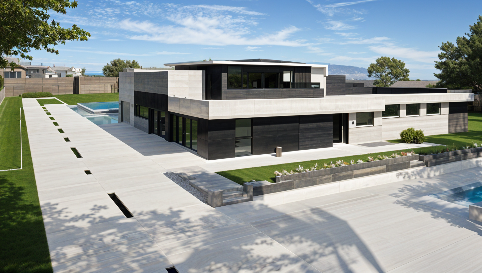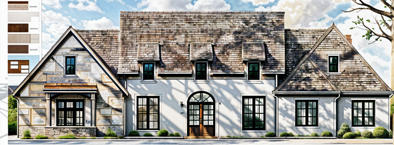 modernist exterior shot create a realistic exterior rendering with landscaping a sidewalk to the front door and a concrete driveway keep all exterior details as shown james hardie siding fascia eaves troughs hardie panels and window trims similar to hardi color grey slate asphalt shingles black overhead garage doors to match siding black front door brick to be ixl in colour tundra ironside architecture