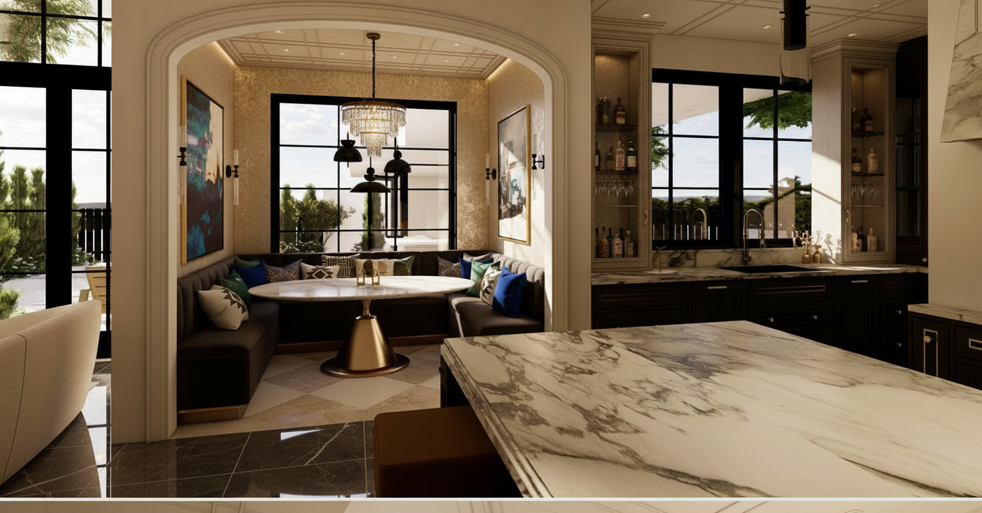 crea una imagen fotorealista a partir de este sketchup resalta las texturas e iluminacion manten los colores originales los muebles son azulados y la encimera balnca