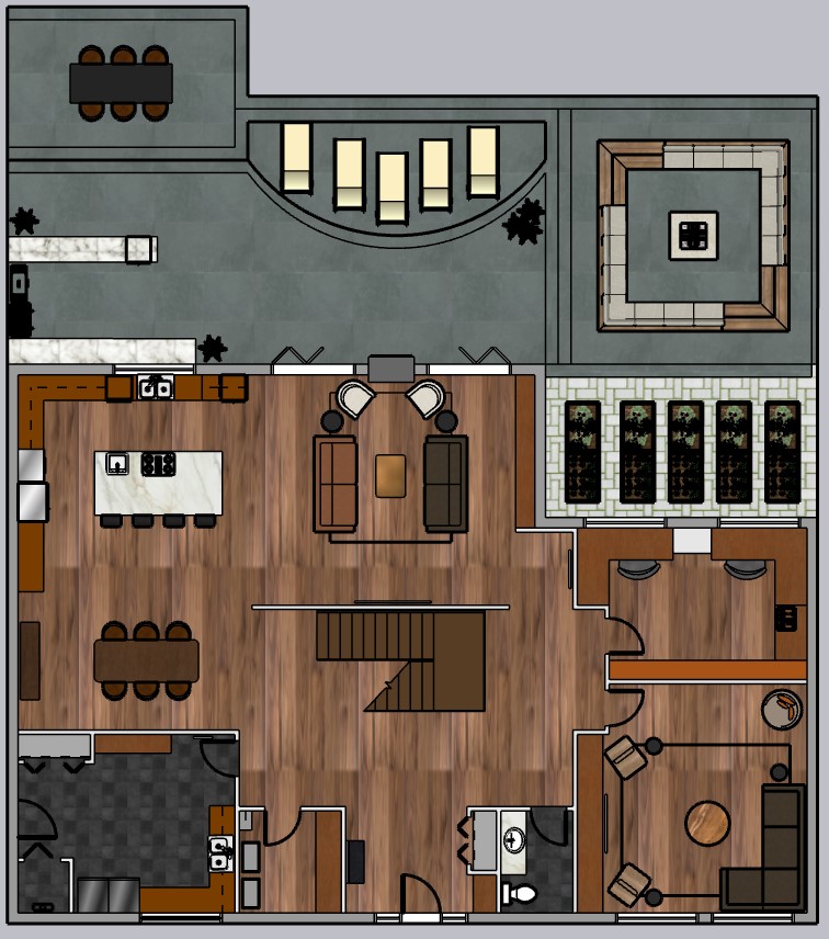 make this floor plan phot realistic and add some daylighting with light through windows and shadows bring the walls up to create a 3d effect and make all furniture 3d maintain plan view