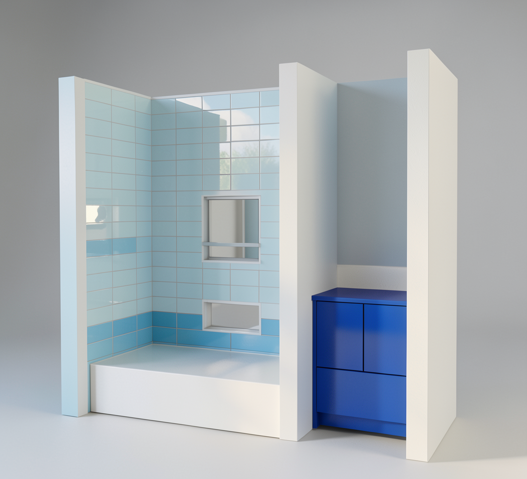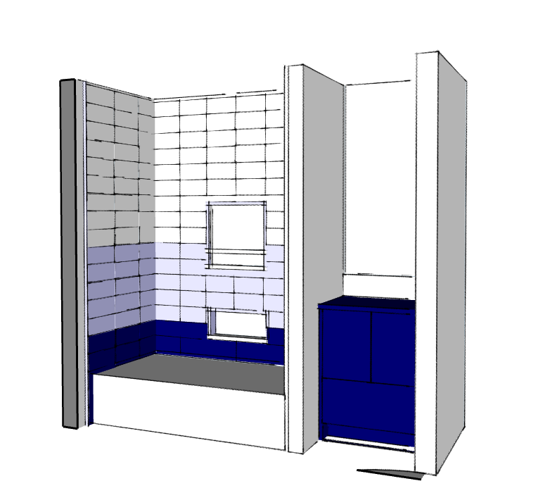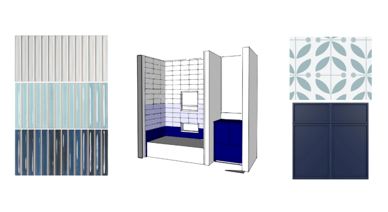 exterior shot keep exact layout of perspective drawing scale tiles to 5 x10 use navy blue for vanity cabientry use florals on all walls for wallpaper
