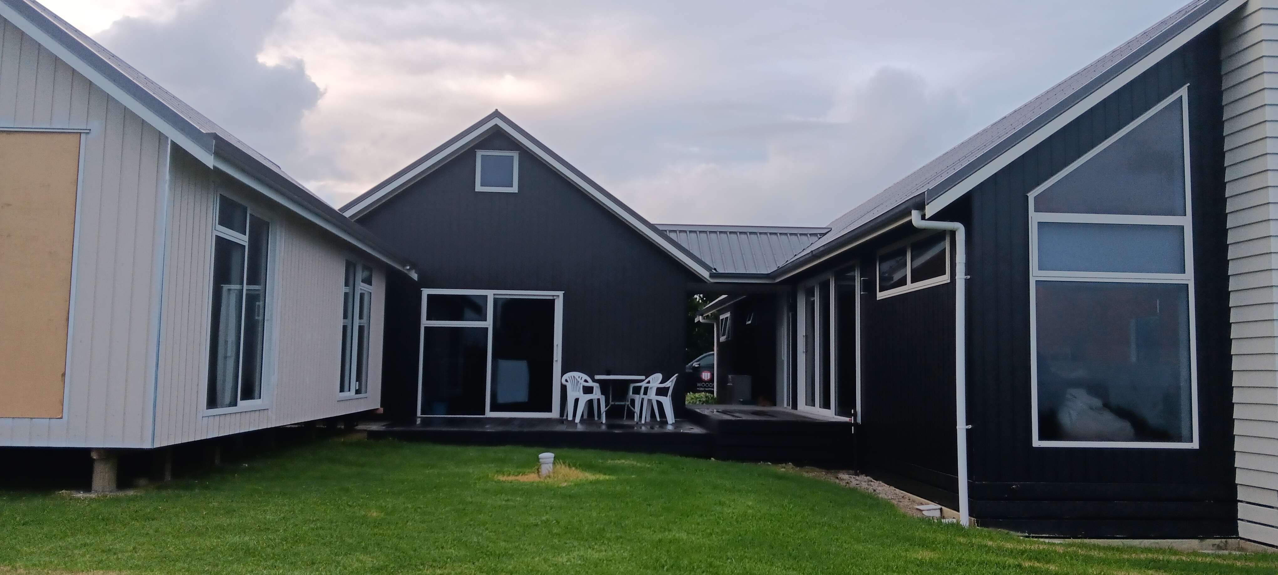 here is a clients house we are installing a shadescape gable canopy from the left building across to the right building to cover that entire area our client is also building a new deck to create a new outdoor area