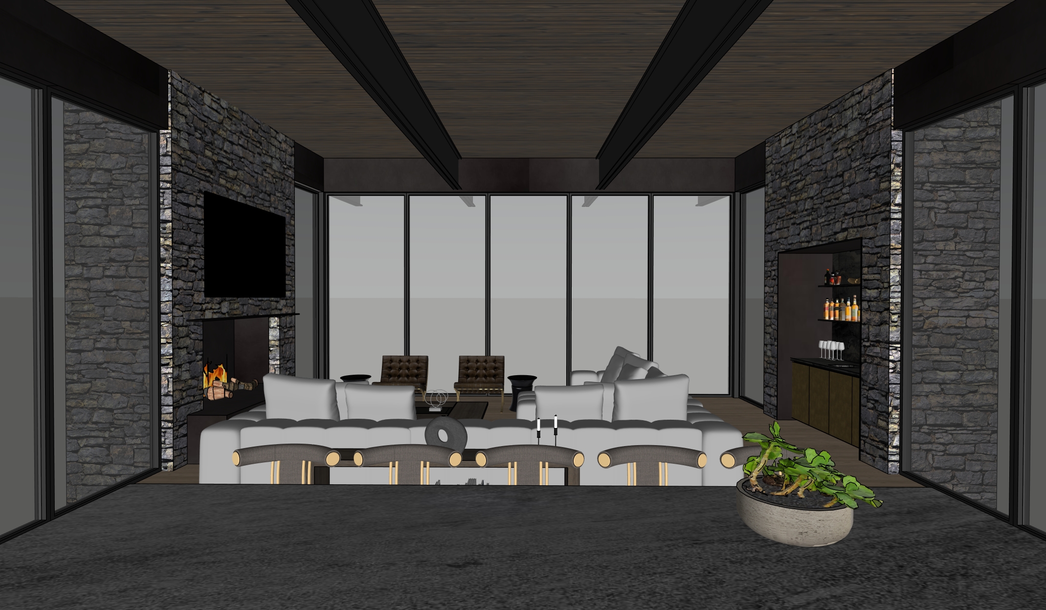 do not remove or change any geometry in image rough hewn tennessee fieldstone stained straight grain white oak tongue and groove ceiling dark metal window frames cold rolled steel beams dark metal panel walls brass lower cabinets and glass shelves at bar add square can lights to ceiling add integrated led lighting in bar area home located in north carolina hardwood forest with dense trees below home late afternoon light with partly cloudy skies view of blue ridge mountains in distance room is 20 above the ground so no plants or hardscape directly outside of windows