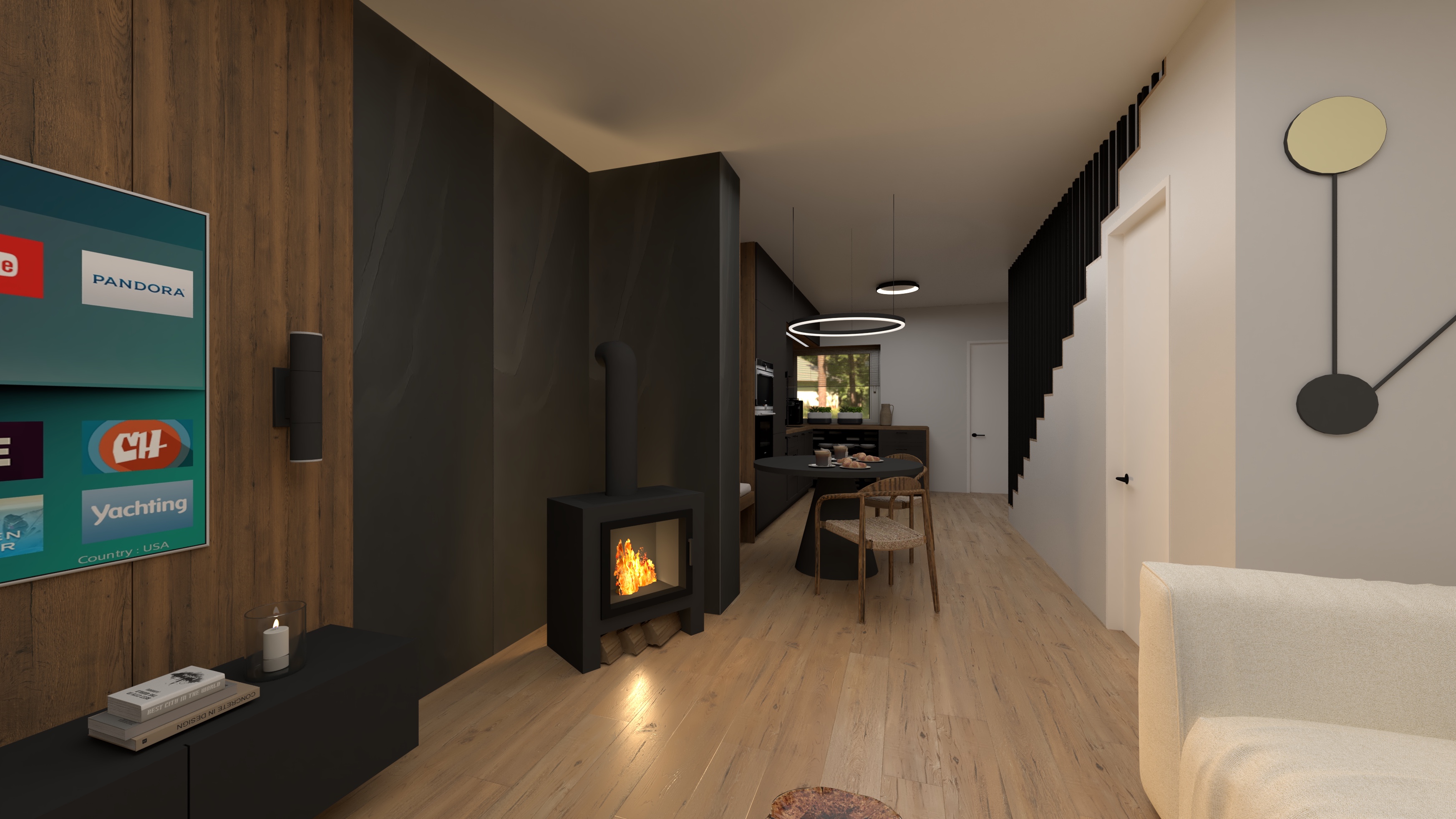 improve the realism of interior render while keeping the exact layout camera angle and furniture placement unchanged enhance natural daylight add soft warm led lighting 3000k to shelves and under cabinets improve material textures and reflections increase contrast depth and shadows for a premium architectural visualization
