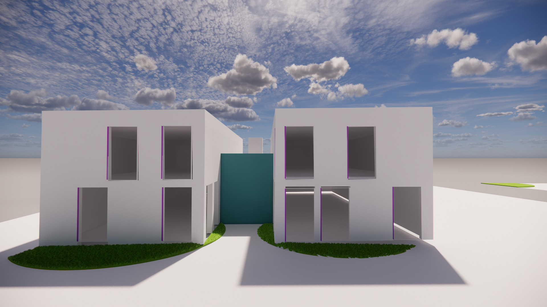 the buildings should be made of reinforced concrete the green surfaces should include low planting and there should be people walking around the area through the windows people and tables and on the second floor bedrooms the blue surface is intended to be a metallic surface made of multicolored threads on the right building in the front of the windows add tables outside
