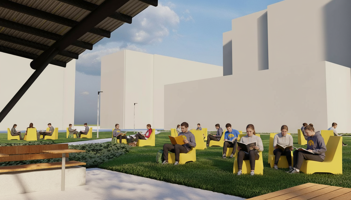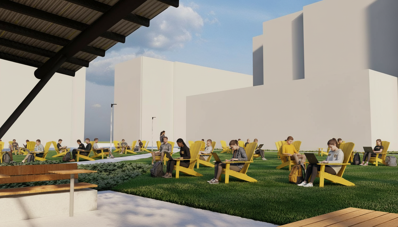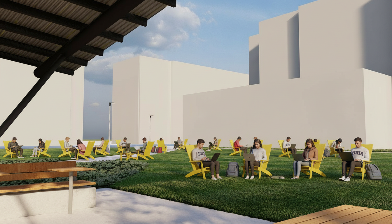 don t change background show 15 loll yellow lounge chairs scattered in lawn with university of iowa students studying dont show any chairs on left of screen under pavilion