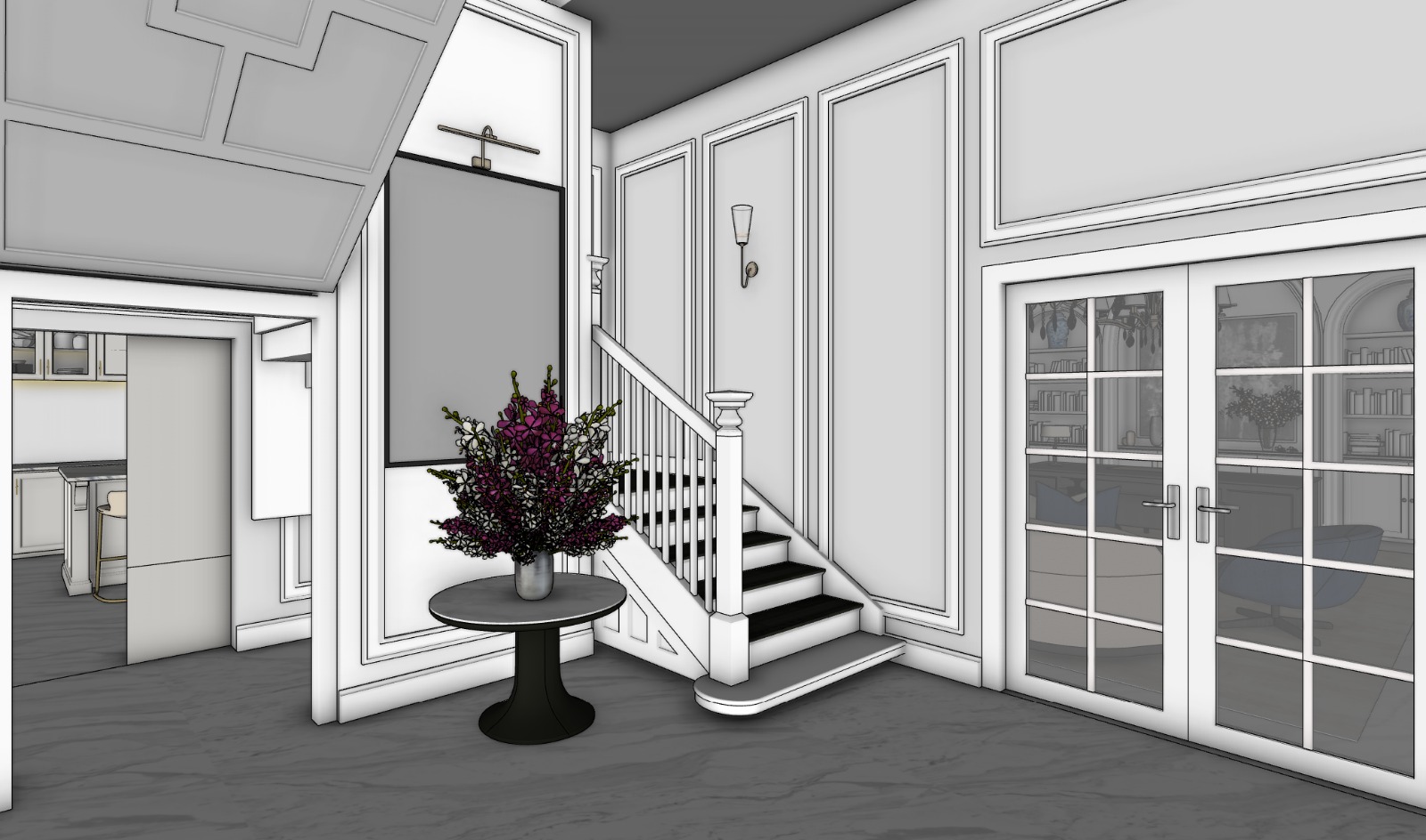 walls ceilings windows and doors in white all flooring in statuario white marble staircase risers and treads in timber dark black wood