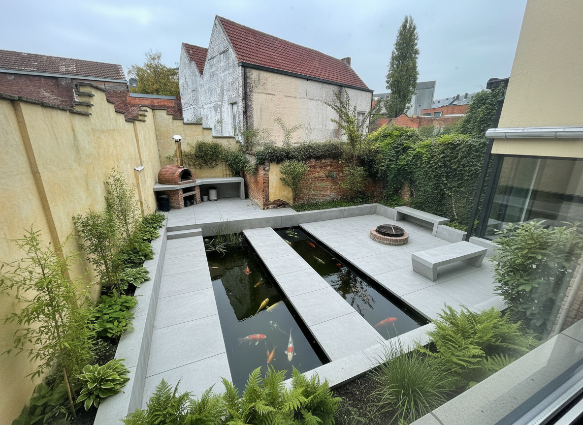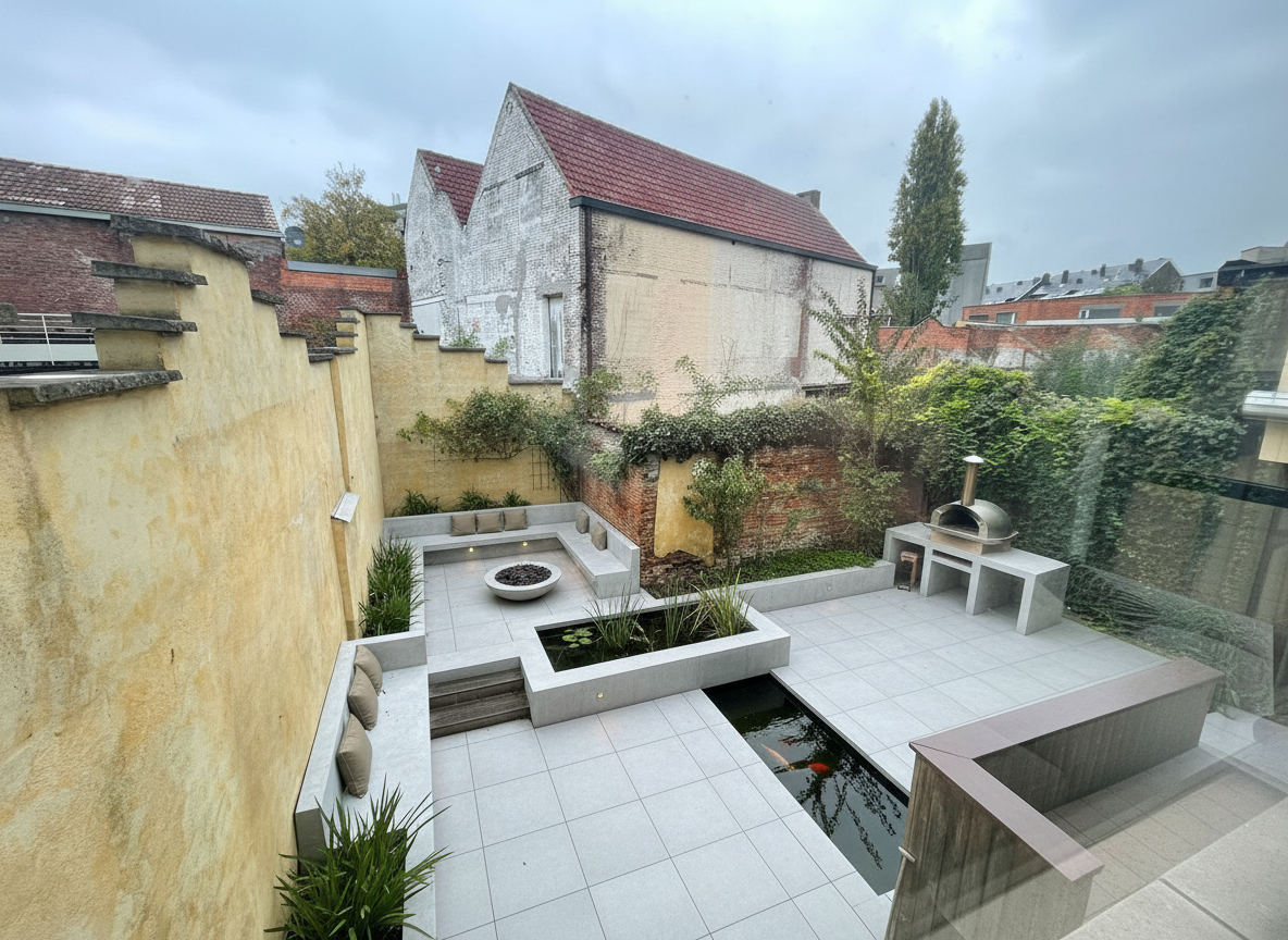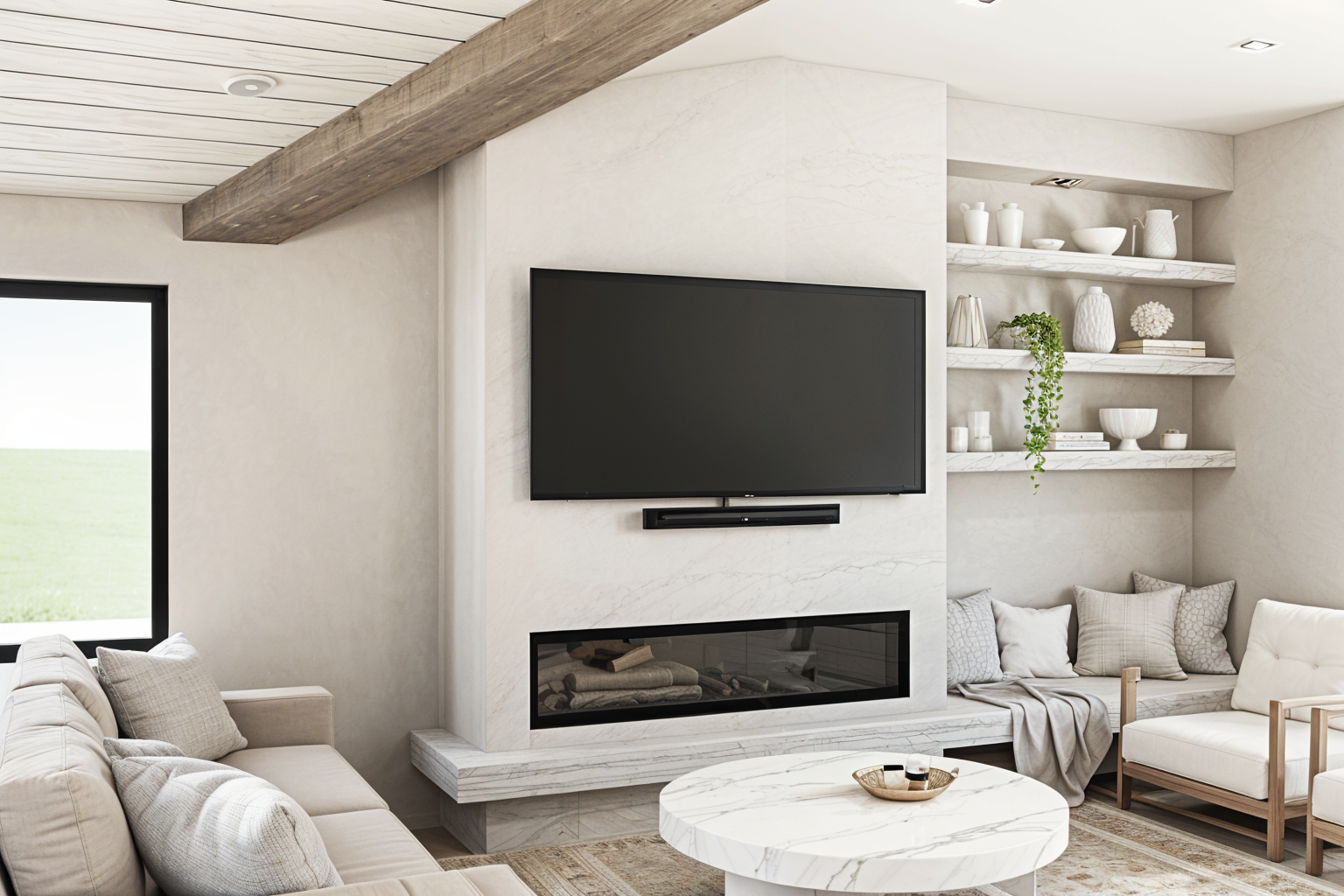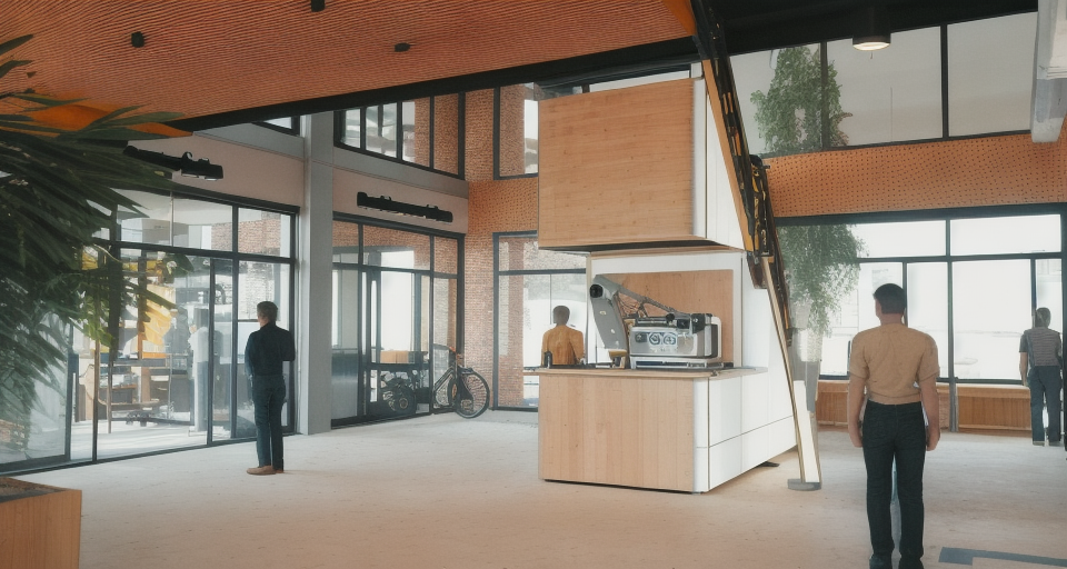 modernist interior shot industrial coworking space wooden details robot arm serving coffee architecture