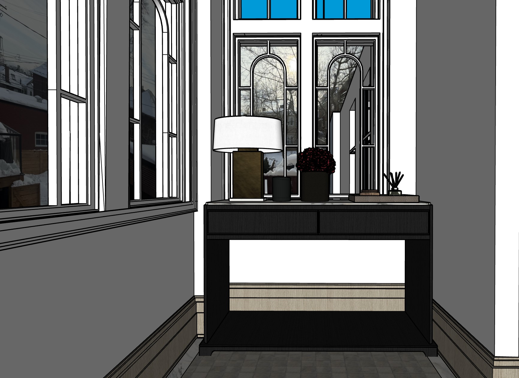 a beautifully rendered interior hallway with classic elegance featuring tall arched windows that allow soft daylight to illuminate the space the walls are painted a sleek soft gray complemented by white trims the console table is made of dark polished wood adding a touch of sophistication on the table a white ceramic lamp glows warmly next to a black vase filled with deep burgundy flowers creating a striking contrast books and decorative items in earthy tones are neatly arranged a luxurious atmosphere with a cozy and serene feel the checkerboard floor tiles are in subtle shades of gray and black enhancing the refined ambiance