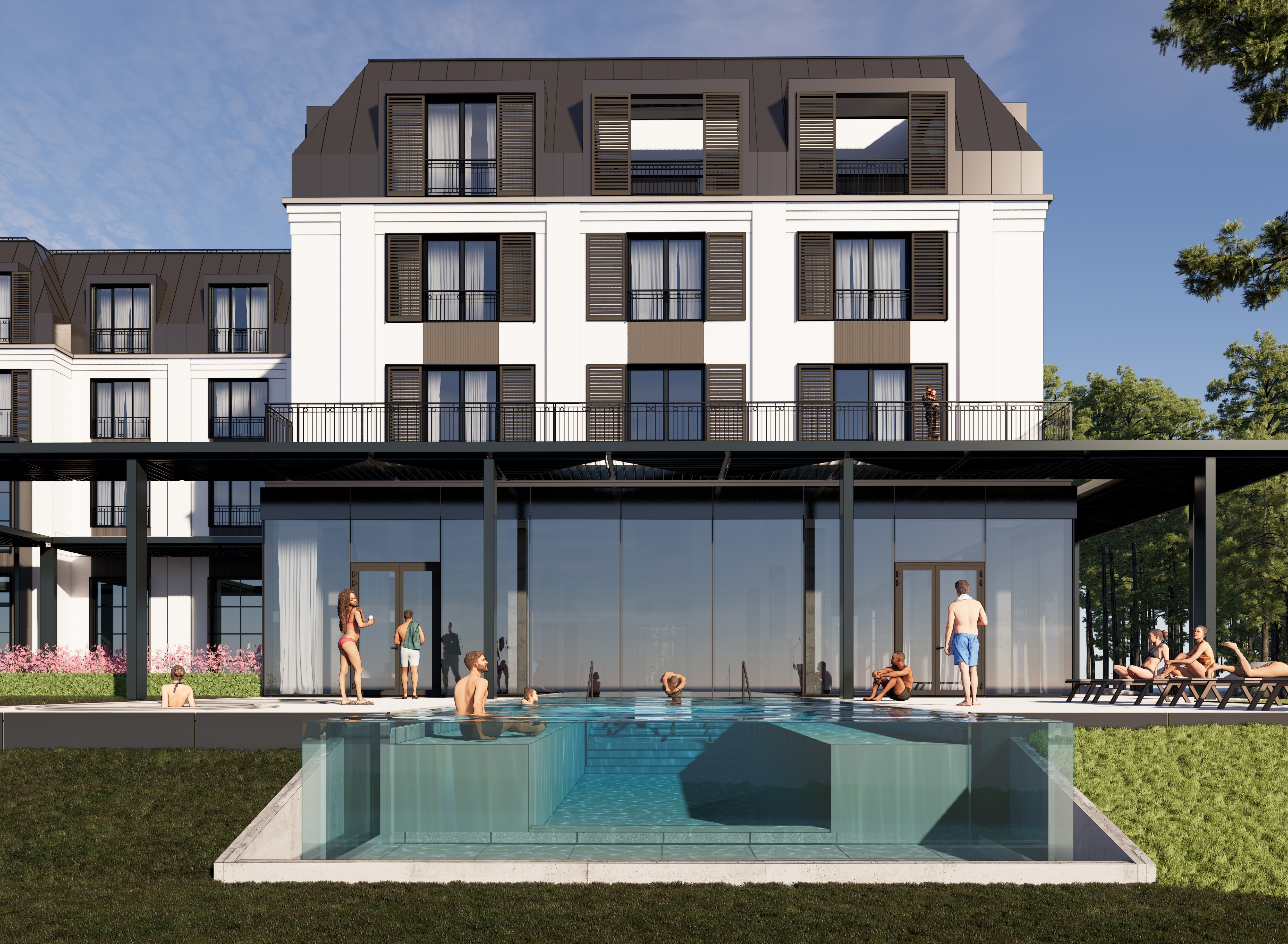 transform this image into a hyper photorealistic architectural visualization replace all non realistic materials with lifelike versions maintaining the dominant color palette add natural subtle sheen and glossy highlights on metals glass wood surfaces create realistic textures on concrete plaster and fabrics with micro details change background to serene lake region surrounded by dense forest enhance surrounding environment to ultra realistic quality while preserving exact structure and shape of bushes trees grass and lake detailed bark textures with moss on trees natural leafy density variation on shrubs short grass blades mixed with soil patches reflective lake surface with gentle ripples realistic water depth and shoreline details preserve natural forest floor under trees as woodland litter and earth leaf litter pine needles moss patches soft brown soil texture blending seamlessly add precise environmental reflections in every glass pane capturing surroundings bright high key lighting throughout with even daylight illumination no harsh shadows clear blue sky with soft clouds ultra detailed 8k photorealistic render professional architectural photography style