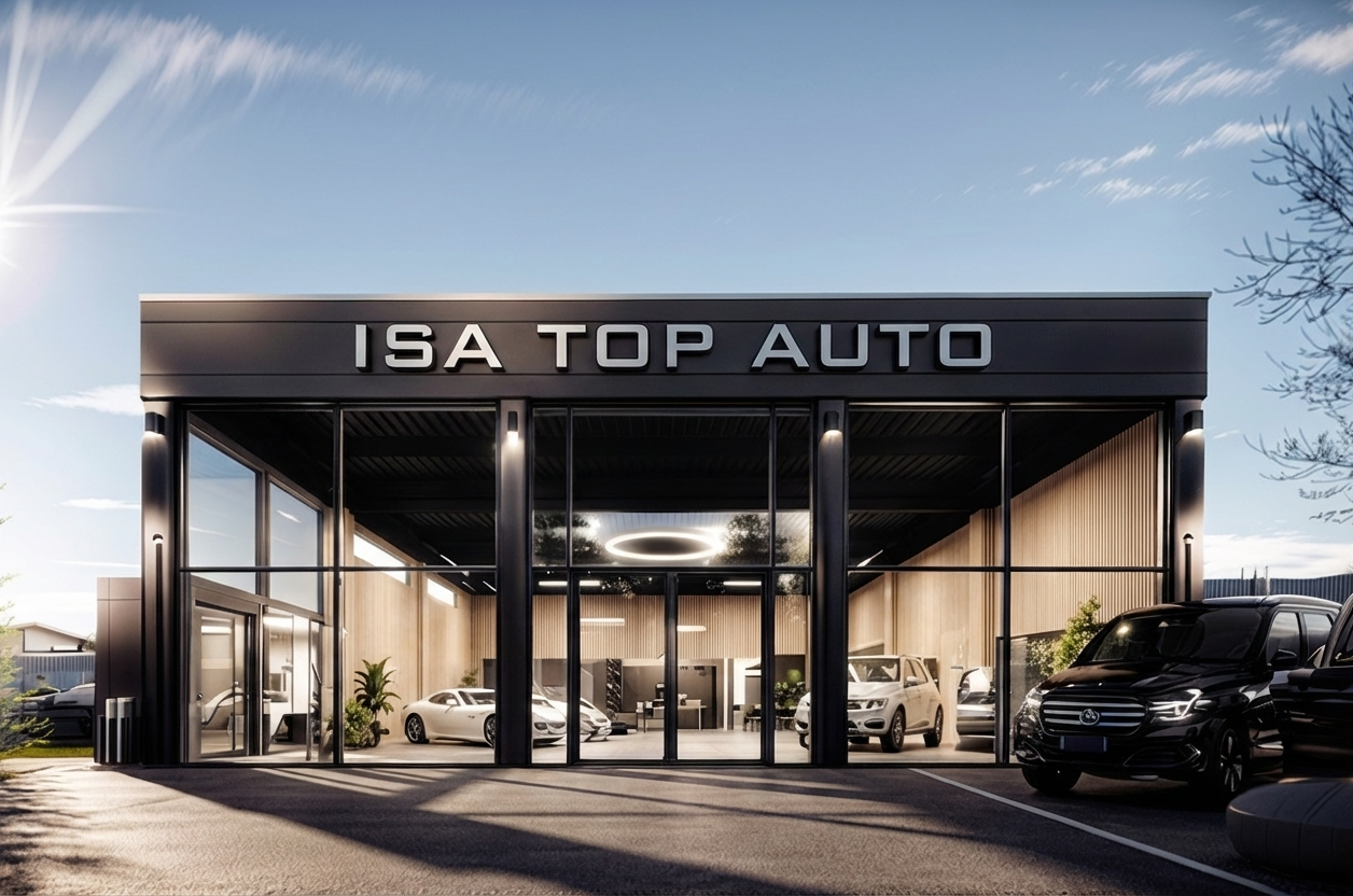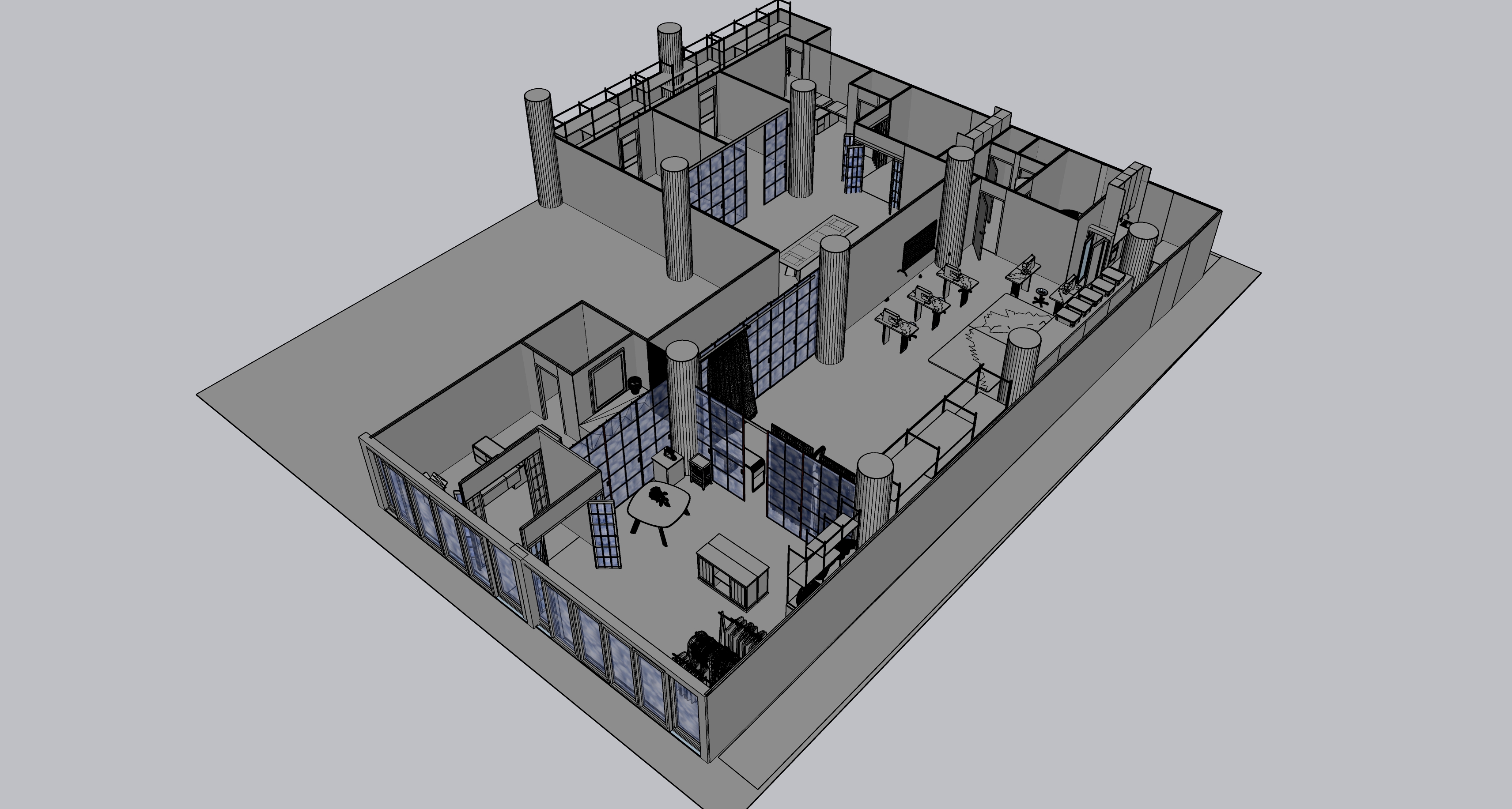 industrial offices and seamstress workshop upper interior view grey floor cocrete columns concrete walls black iron framed glass doors gren window frames on facade
