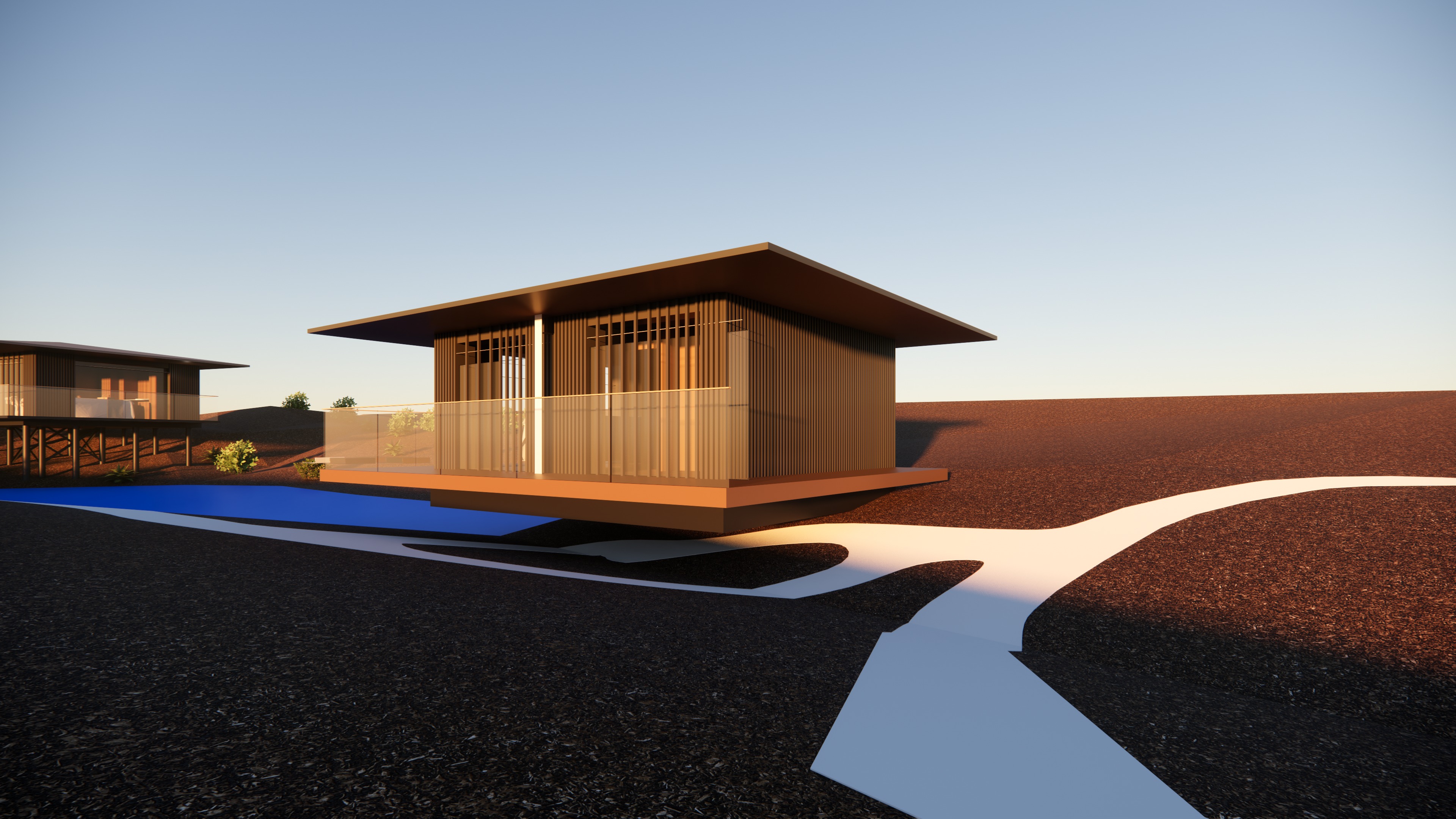 this is a house on top of small pond with small trees in the background the wall material is black burned wood please make it realistic and leave the landscape as it is the ground is dark brown with lush deciduous plants add darmera peltate plants under the house and around waterleave the original structureopenings are in dark black