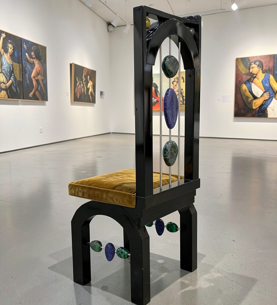 chair frame is black laquer seat is a mustard velvet the stone in the center stone of the back is a lapis and put chair in a art gallery change the beads on the bottom to organic lapis and malachite