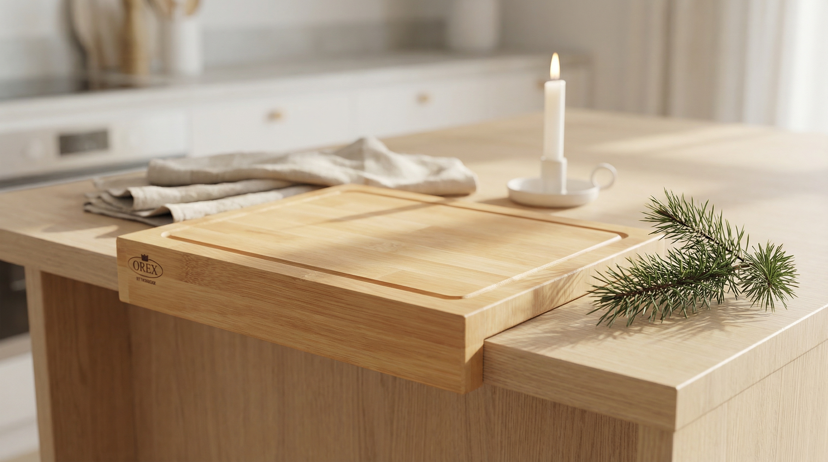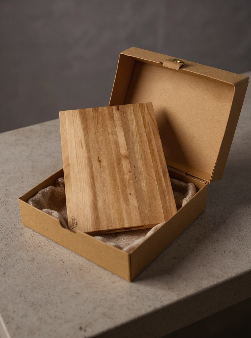 transform the scene into a refined luxury gift reveal the solid wood cutting board rests inside an open matte kraft paper gift box lined with soft natural fabric the box sits on a warm neutral stone surface in a minimal studio environment soft warm top lighting slowly fades in revealing the natural wood grain and edges with elegance subtle motion the lid of the box is already slightly open and gently settles into place while the camera performs a slow cinematic push in clean calm premium aesthetic inspired by scandinavian and japanese minimalism shallow depth of field soft shadows ultra realistic textures no hands no people no text no logos added no deformation of the product timeless holiday gift atmosphere without seasonal clich s