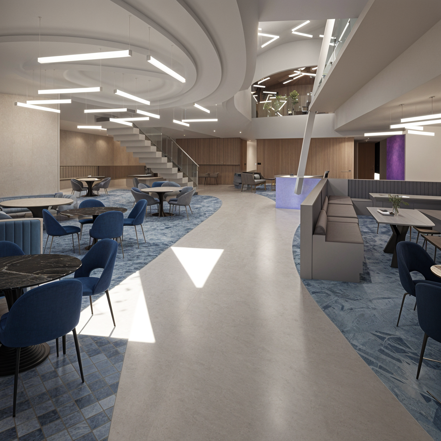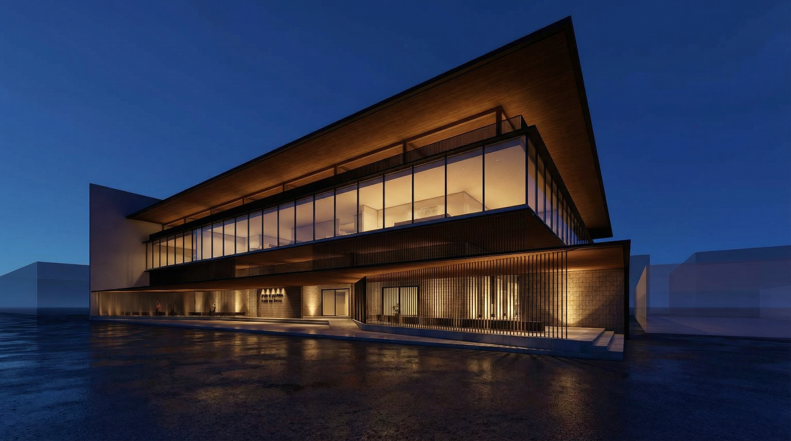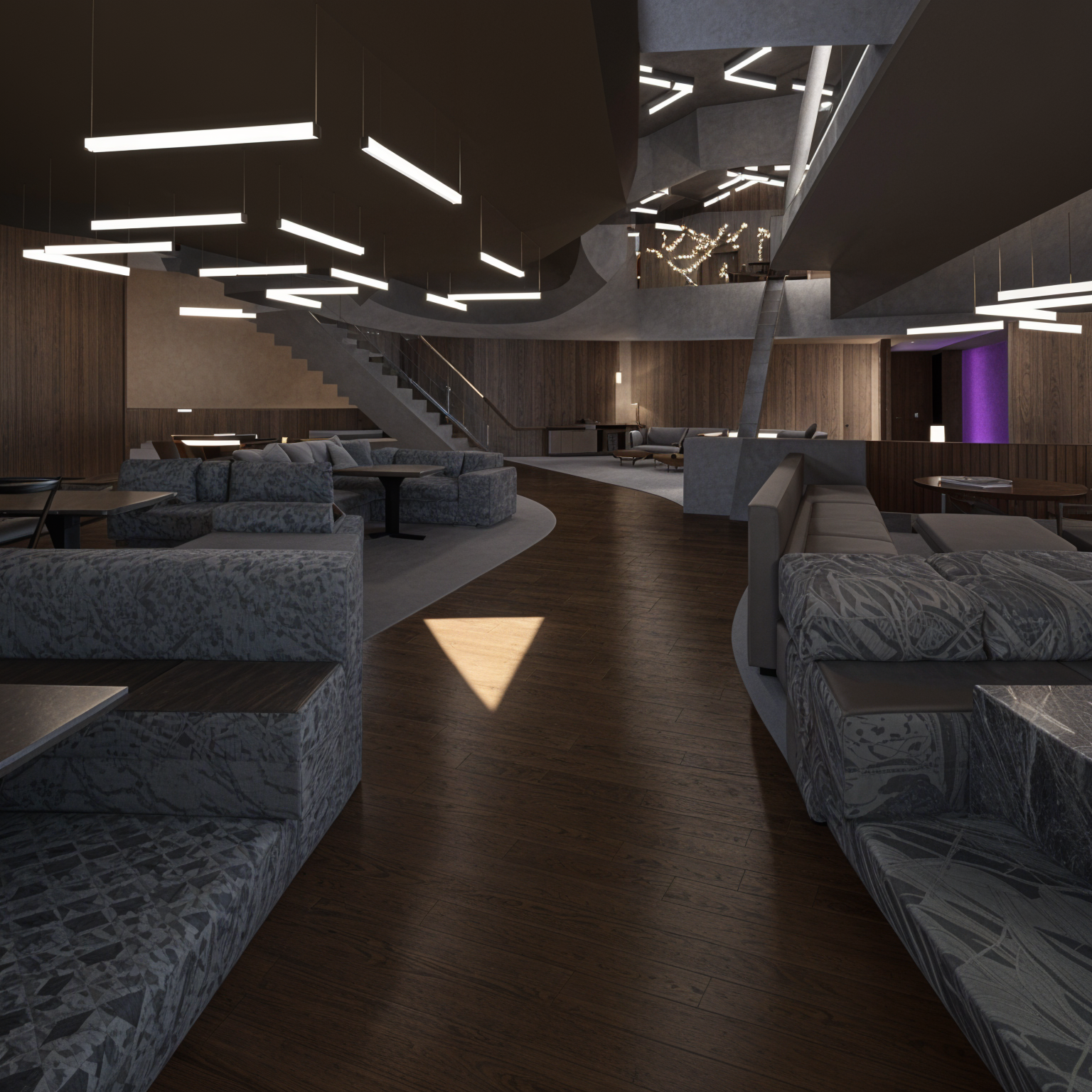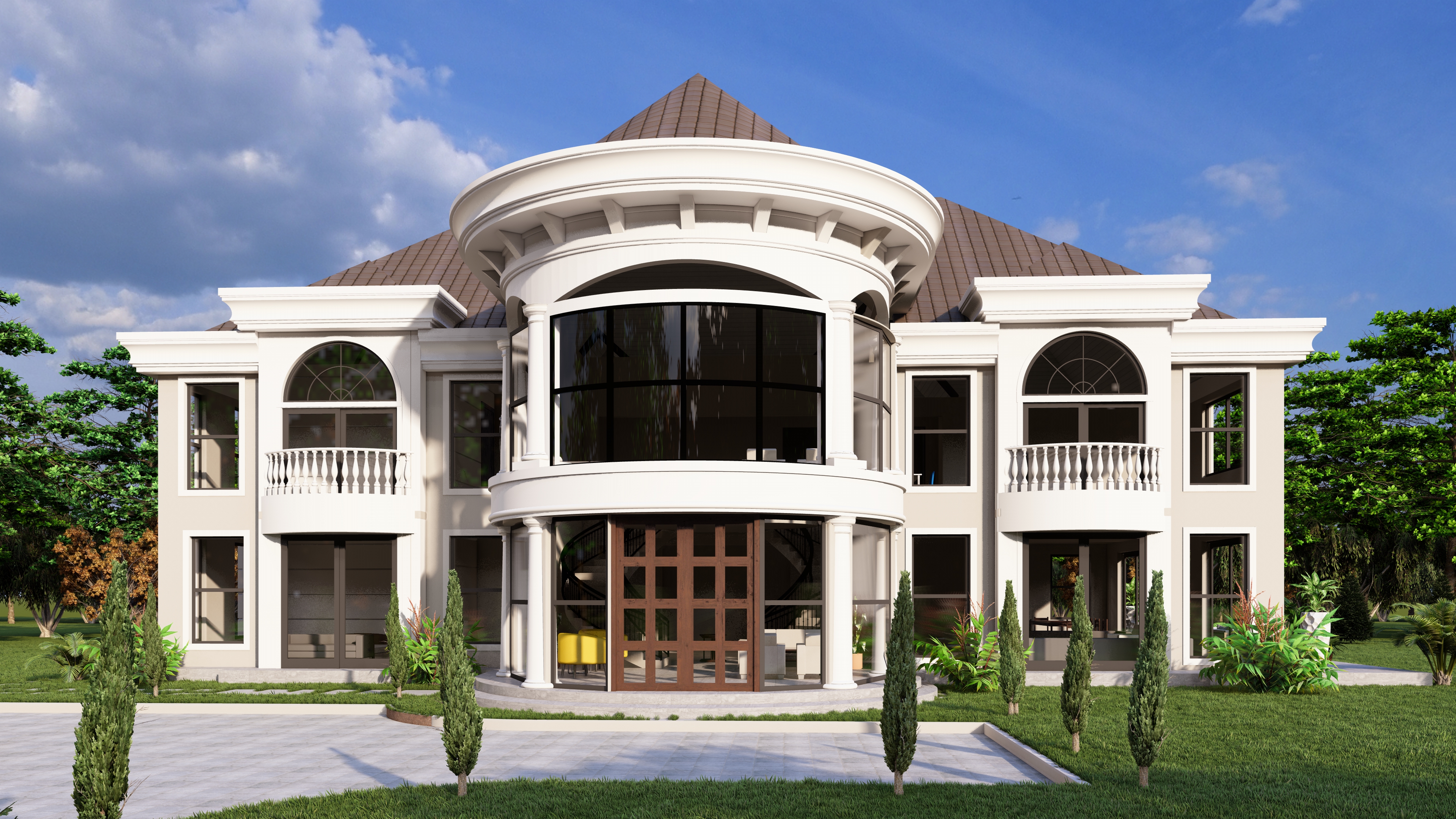 this is a maisonetter with front side being curved almost cylyndrical while retaining the model as is please increase exposure of the scene by making it brighter with daylight add indoor warm lighting add some exterior wall lights improve texture of all surfaces