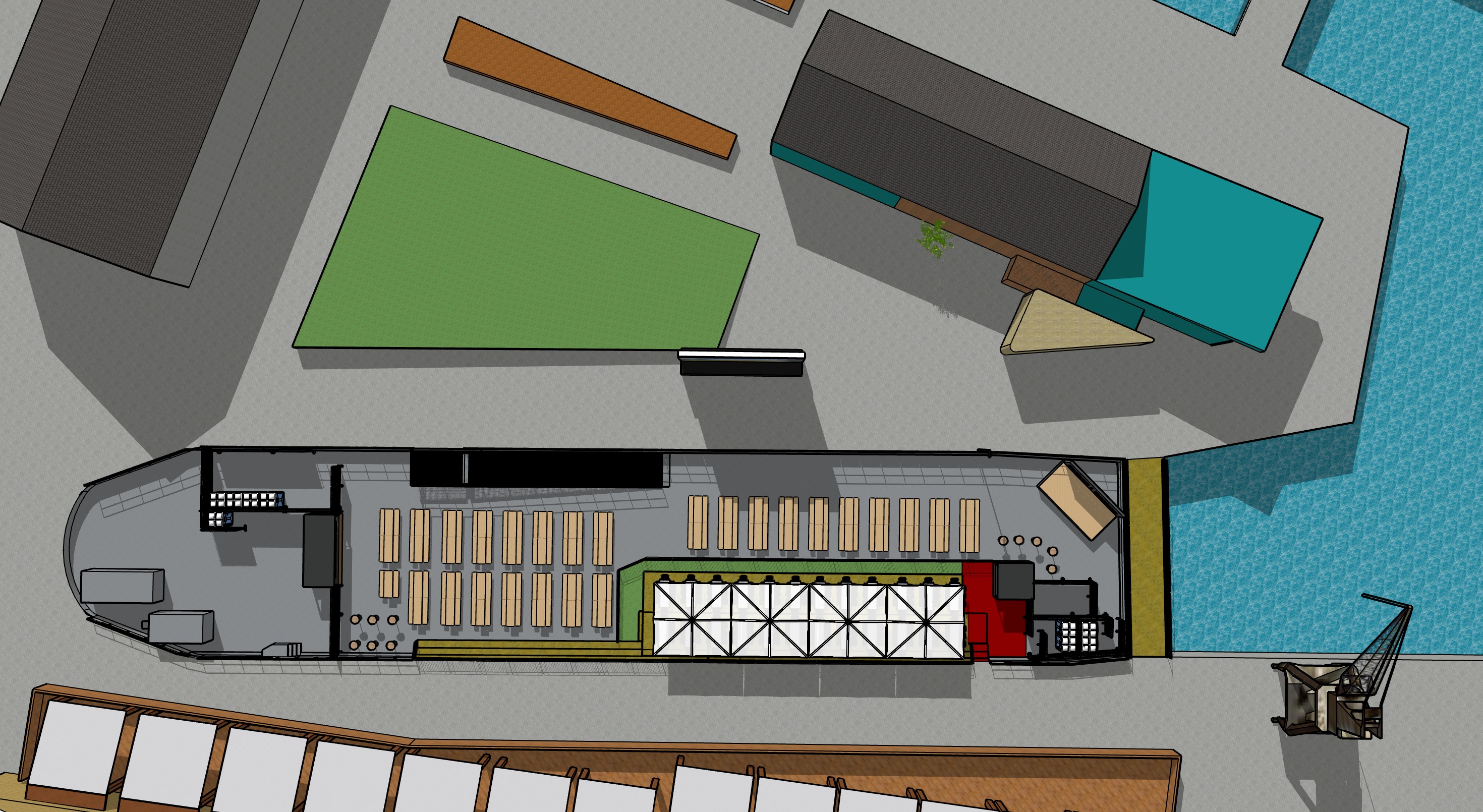 lag en presentabel 3d modell av konseptet fotball i dokken modellen skal v re en detaljert fremstilling av den eksisterende designen fra sketchup spesifikasjoner behold den eksakte layouten og posisjonen til alle elementene inkluder det lange gr b taktige strukturen ved kaien med rader av lysebrune benker og bord et sentralt gr nt turfomr de dekket av et hvitt teltlignende tak runde barbord ved siden av benkene en r d vip lager seksjon i den ene enden s rg for at den omkringliggende milj et er synlig inkludert gr brosteinsbelagte kaier ulike bygninger i m rkegr gr nn teal og brun bl tt vann og en kran i n rheten pass p at ingenting blir endret eller flyttet p i designen og at alle elementene er tydelig representert uten tekst