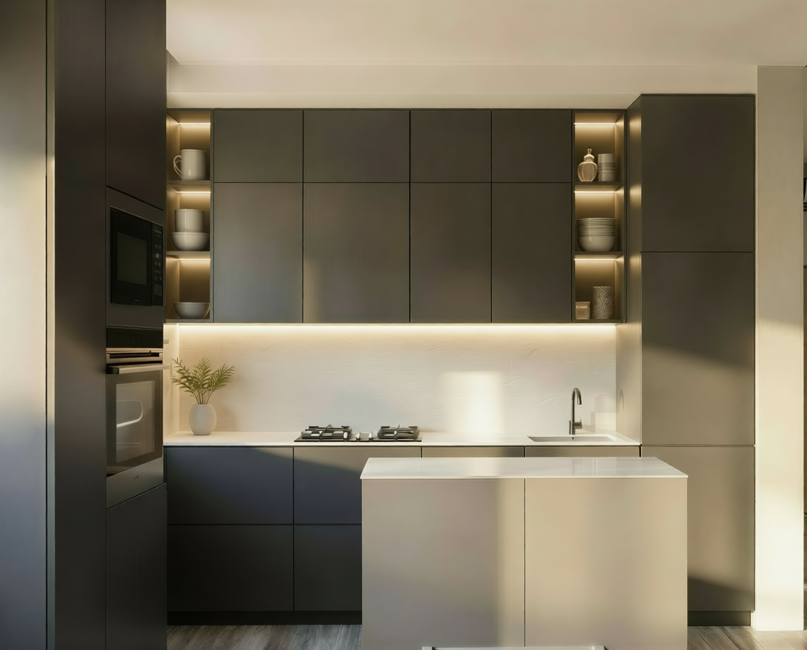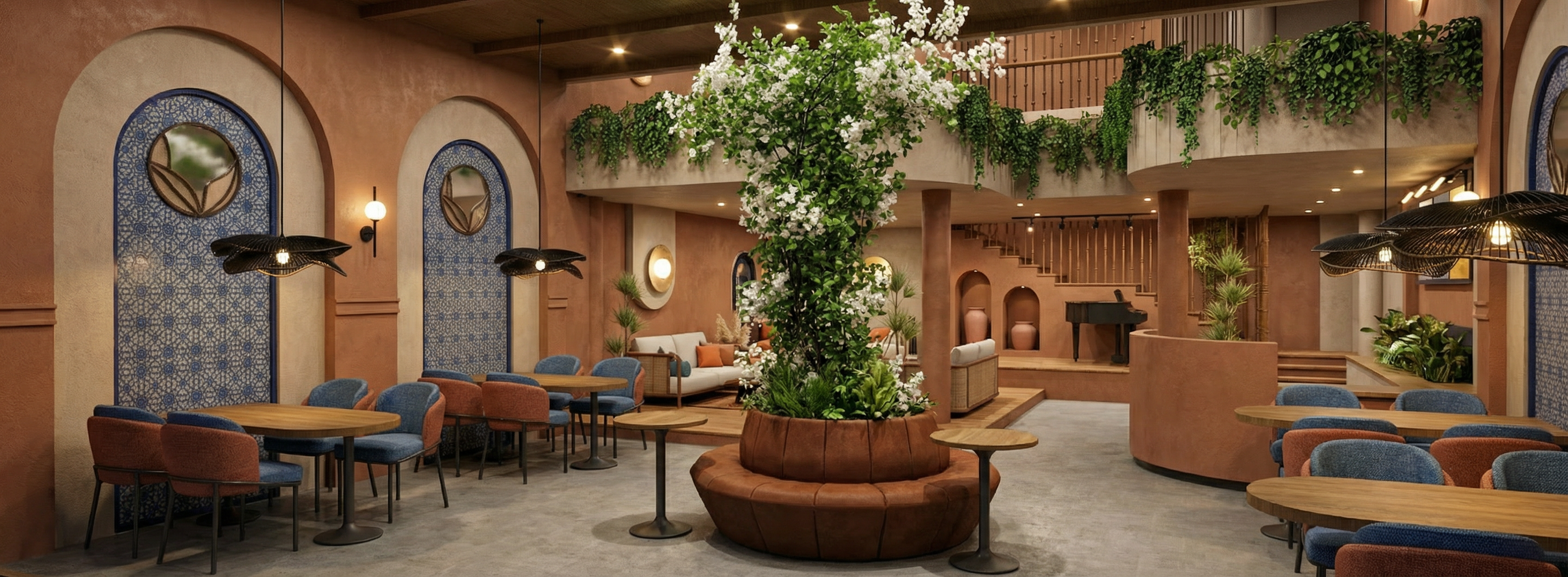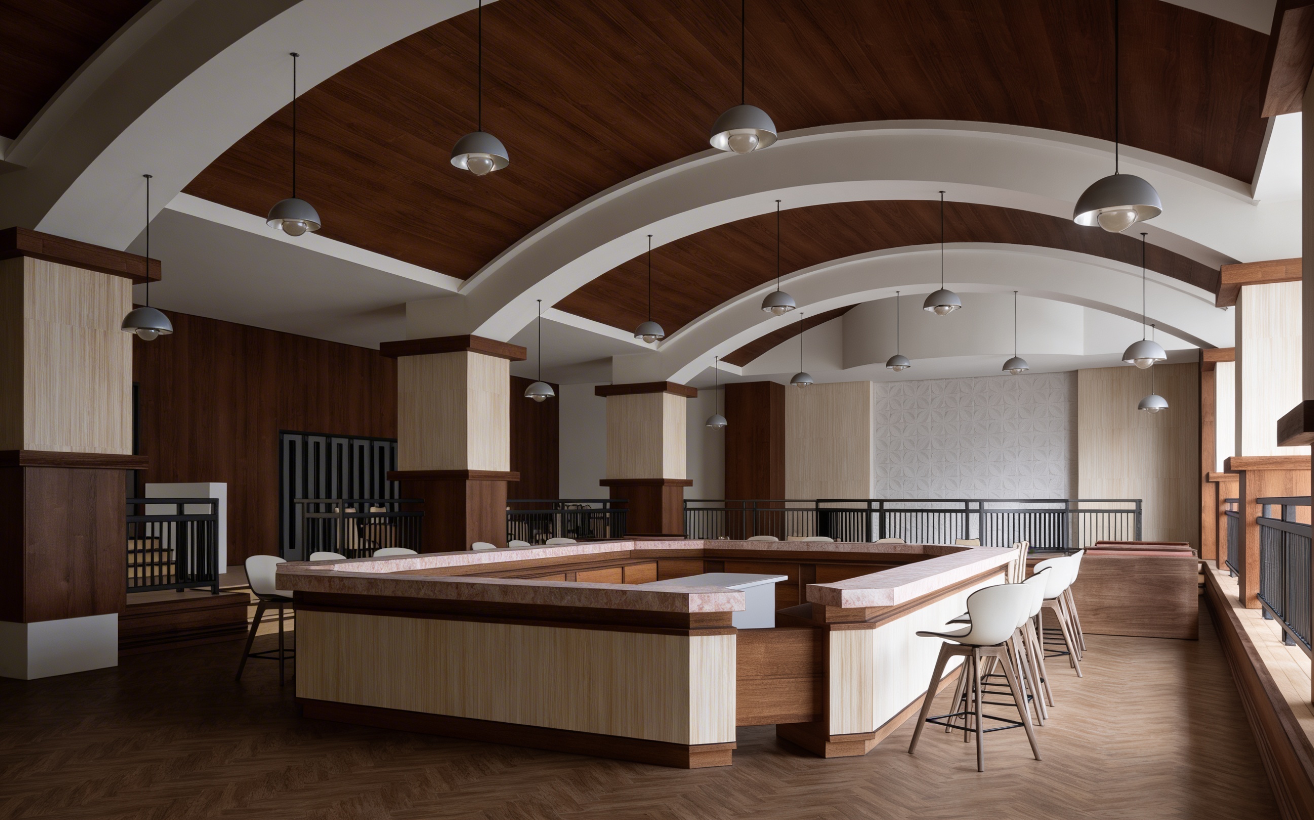 restaurant interior with illuminated fabric panel and bar counter
