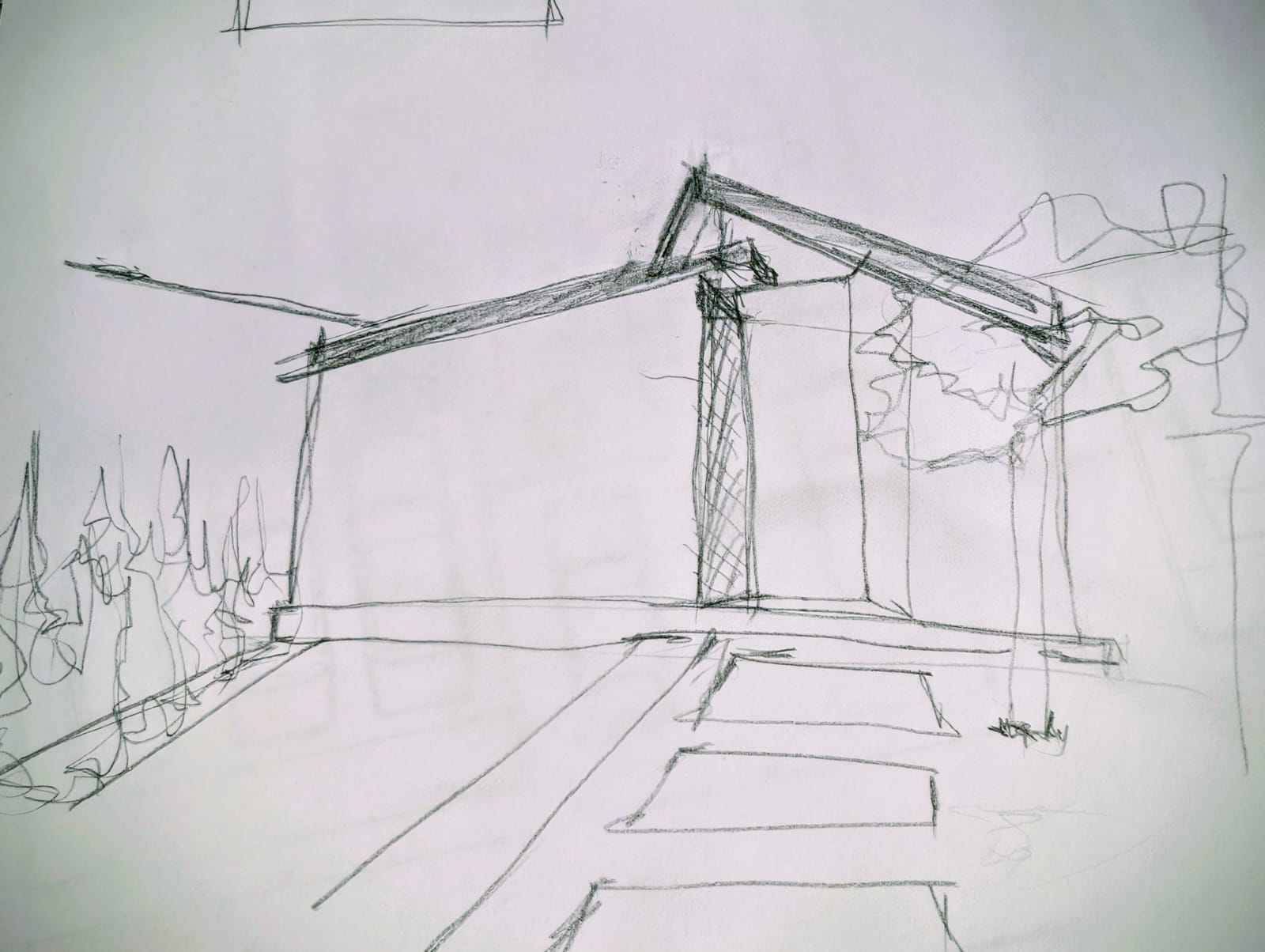 exterior shot contemporary cabin with a facade of large glass windows with a pool on the left side and a tree next to the entrance to the center