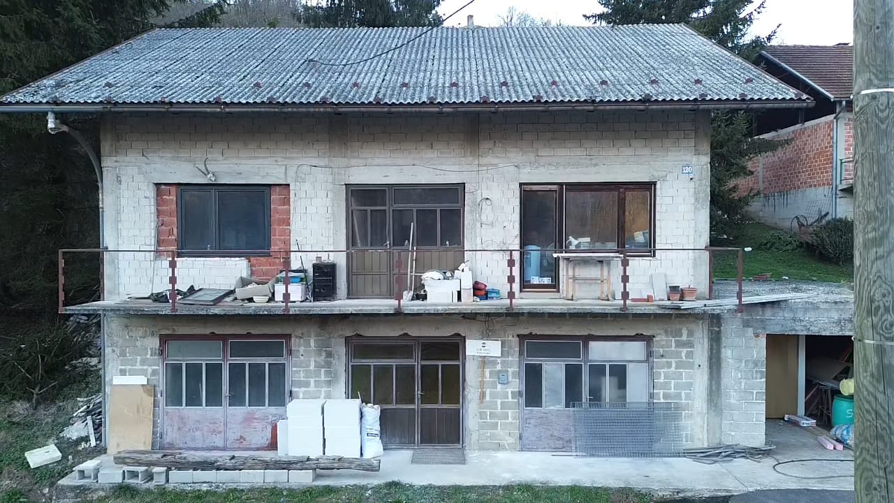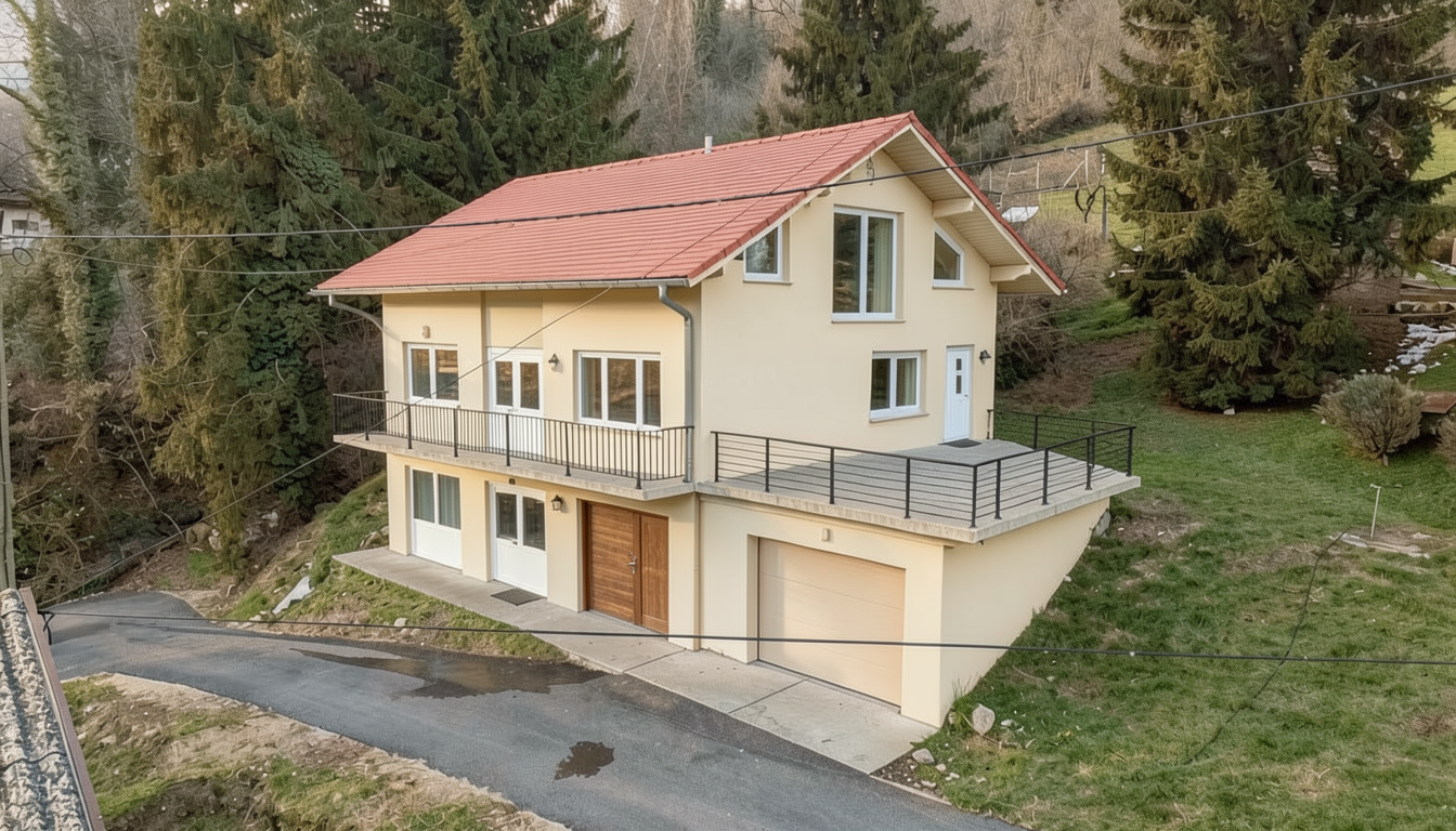 facade is completely new in light beige color roof is in brick red color doors and windows are new and in white color garage is in light beige color also and on the garage roof there is metal rail remove every furniture rail on balcony is black metal