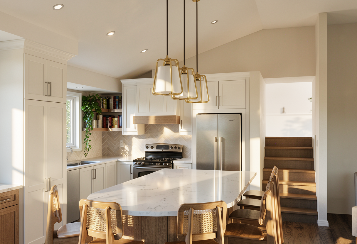add three brass pendant lights over the island