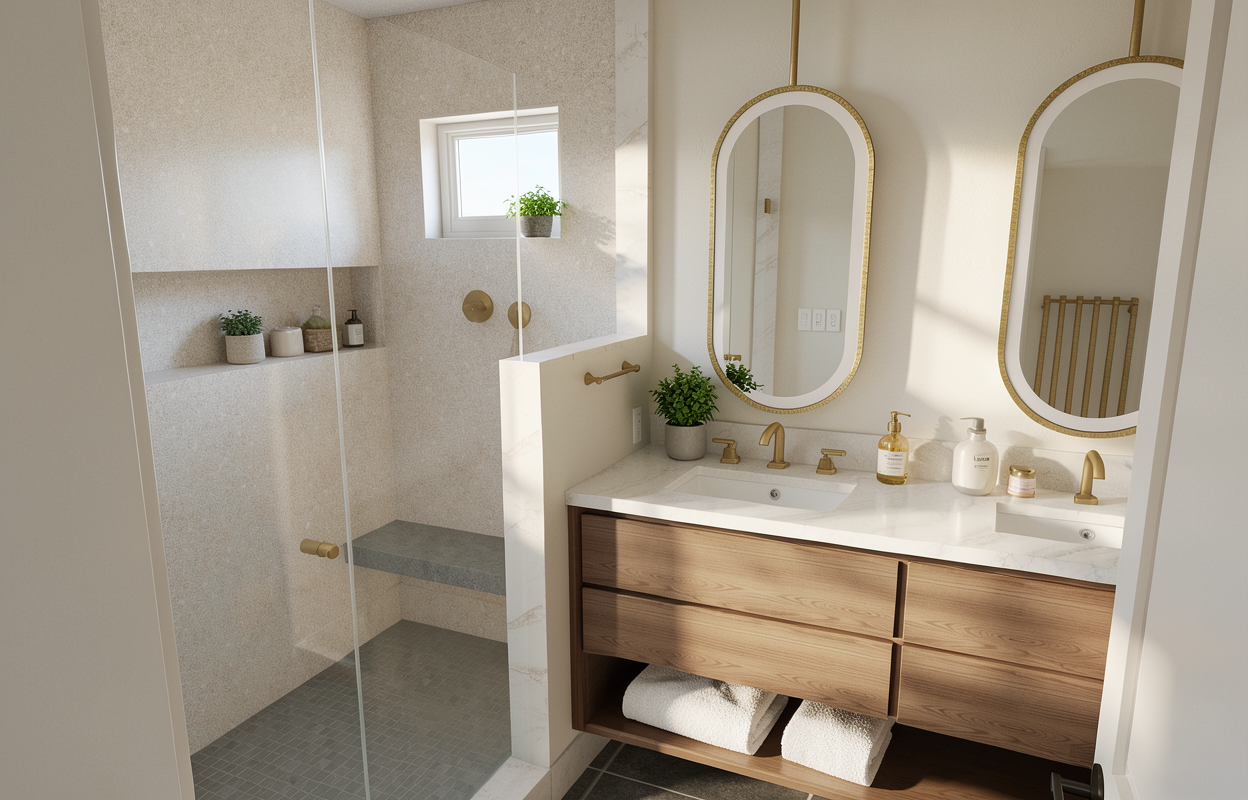 bring life to this rendering with elegant details that fit the feeling of a serene primary bathroom in the morning with simple elements and towels in the bottom shelf of the vanity add simple shower toiletries wall white shampoo and conditioner bottles and a small plant in the shower niche the only natural light is coming from the window in the shower