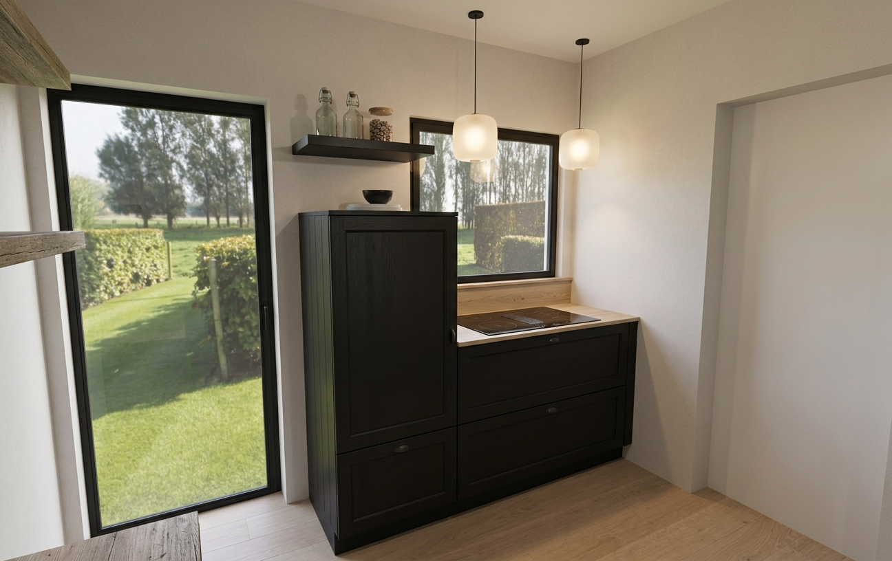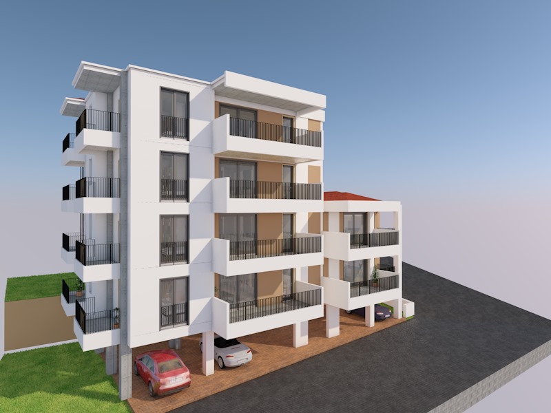 create a stunning digital rendering of a modern apartment building the structure is tall with four floors featuring white walls and soft beige accents each floor has sleek balconies with black railings the windows are large and slightly tinted there is a red tiled roof on an adjacent section of the building the driveway below is crafted with dark gray cobblestones and several cars including a red and a white car are parked there a patch of vibrant green grass surrounds the building contrasting the clear blue sky in the backdrop the atmosphere is calm and picturesque reflecting a bright sunny day with soft shadows add wood under the balconies no wood on the facade