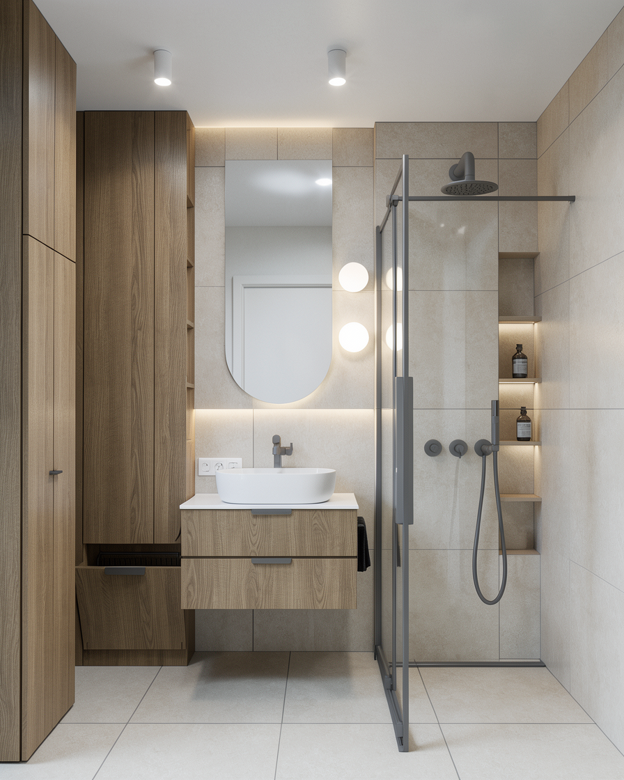 take out the rug and change the floor to a light beige terrazzo make the ceilings a neutral walnut wood color add a flokati wool rug in front of the sofa put beige grasscloth wallpaper on the wall behind the sofa remove the mini split from the wall change the ceiling beam to be a natural walnut color with no knots
