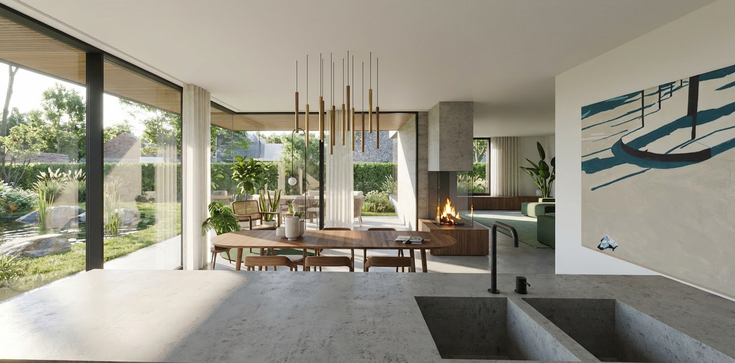 render a stunning architectural visualization of a large house with a modern design the walls are crisp white contrasted with dark slate grey roofs incorporate warm wooden accents and stone textures on parts of the facade for depth and richness surround the building with lush green landscaping featuring carefully shaped shrubs and trees the atmosphere is serene and inviting with soft natural lighting creating gentle shadows and highlights reflect the house in a calm elegant exterior with neutral colored pathways and an azure pool with attached hot tub giving a sense of luxury and tranquility