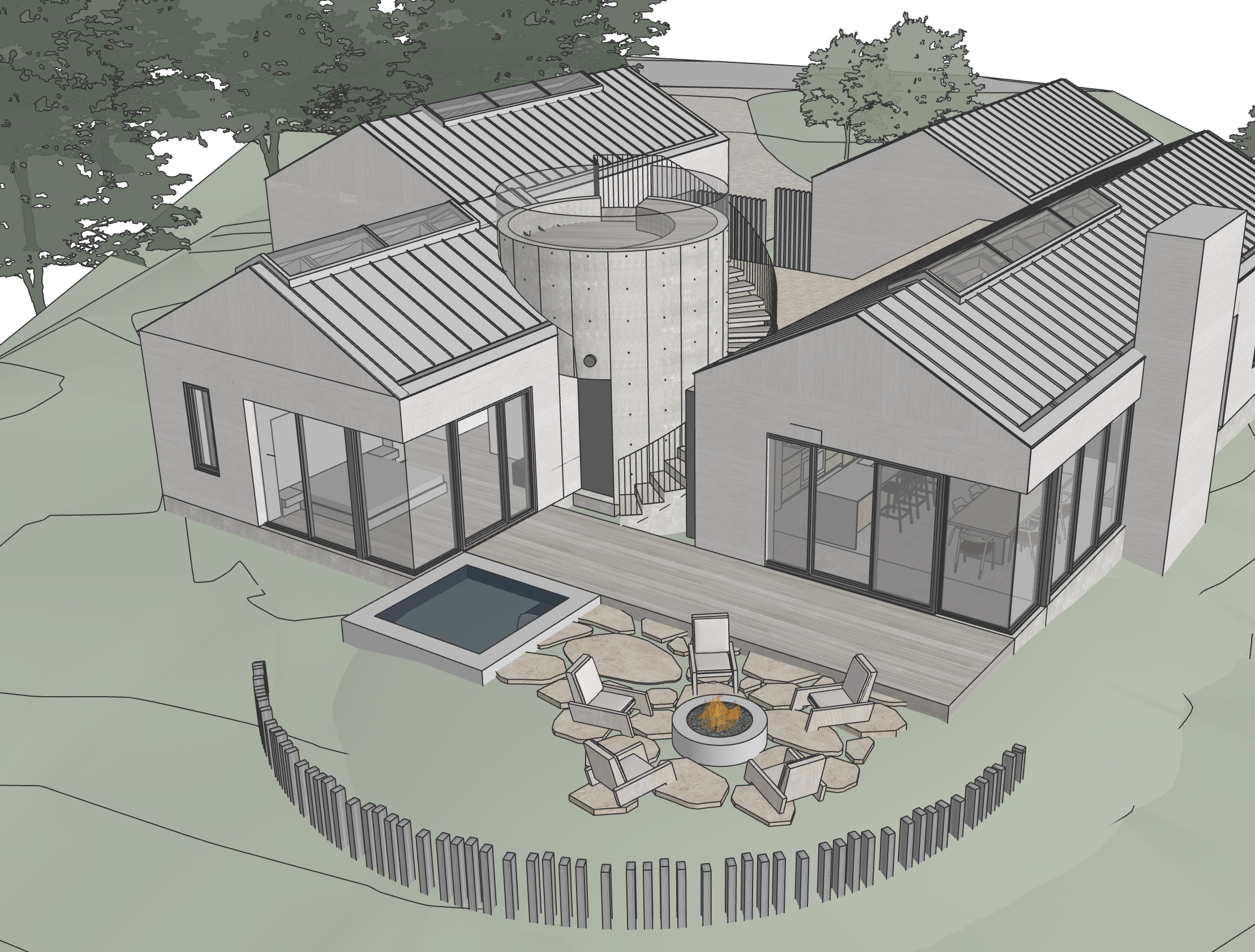 coastal dune scrub planting white linear brick exterior warm flagstone paving at fire pit spa with dark water texture circular tower in concrete with glass railing and fire pit in the middle long horizontal sandy white brick exterior architecture sunny morning light