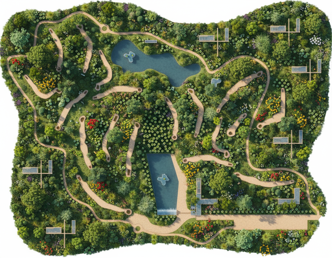 create a stunning representation of a landscape design with a bird s eye view include a variety of natural organic looking winding paths colored in soft earth tones like beige and light brown surround these paths with lush vegetation using varying shades of green to represent different types of foliage and trees natural structures should be interspersed with tranquil water features such as ponds or streams in tranquil blues and teal the overall atmosphere should be peaceful and inviting evoking a sense of harmony with nature reminiscent of africa