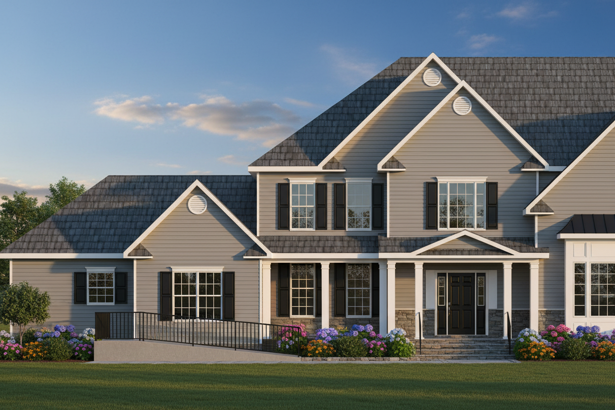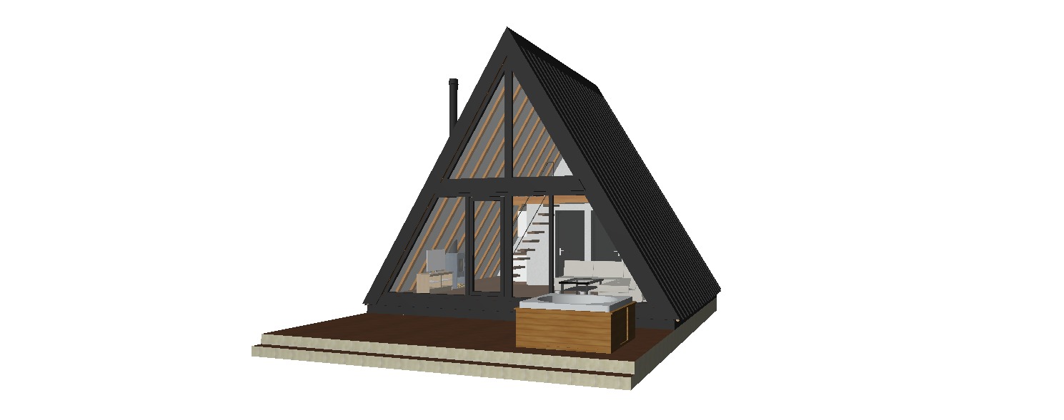 high quality photorealistic exterior render of a modern a frame house the roof and the entire front fa ade cladding are made of anthracite metal sheet including the framing around the glazing anthracite aluminum window and door frames with full height glass infill on the front fa ade visible structural rafters inside the a frame are finished in dark walnut wood tone clearly visible through the glass clean minimalist architecture with sharp edges and precise detailing natural daylight soft shadows realistic reflections on glass and metal surfaces surroundings with lush green vegetation grass and scattered trees mountain landscape flat or gently rolling terrain neutral sky realistic materials ultra detailed textures architectural visualization 4k quality