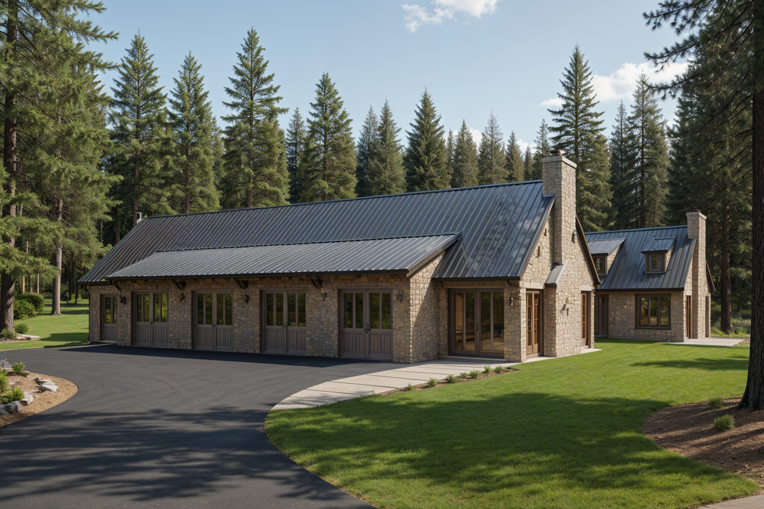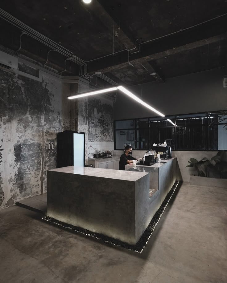 modern minimalist tattoo studio interior 30x17 feet polished concrete floors with black geometric inlay pattern raw concrete walls exposed black painted ceiling with industrial track lighting floating black steel and glass partition walls custom brutalist concrete reception desk with integrated led strip lighting black powder coated steel tattoo stations with adjustable articulating lights floor to ceiling black metal grid display for flash art architectural photography moody dramatic lighting