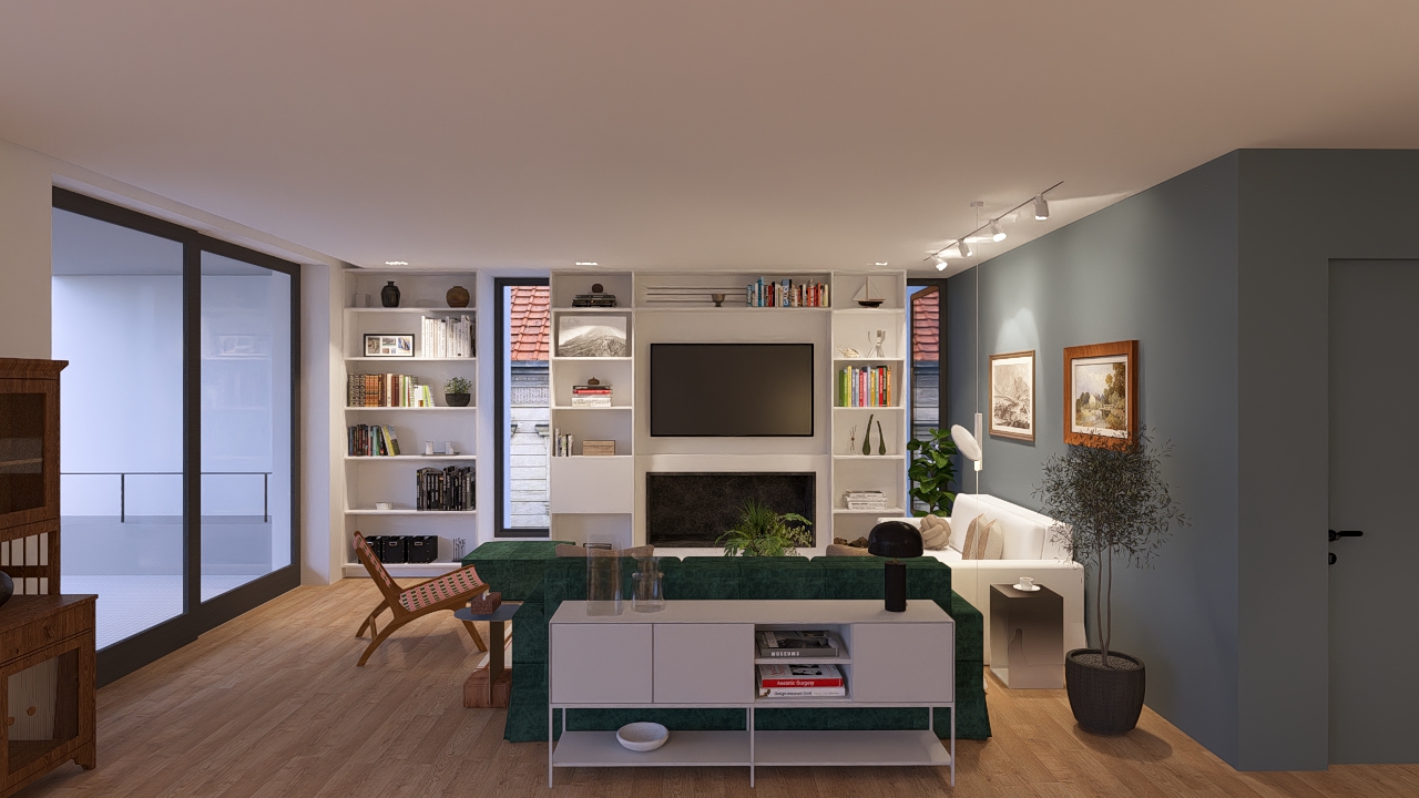 hyperrealistic render improve natural lighting and fix spot light rail to light the paintings and double mounted spots in front of bookcase