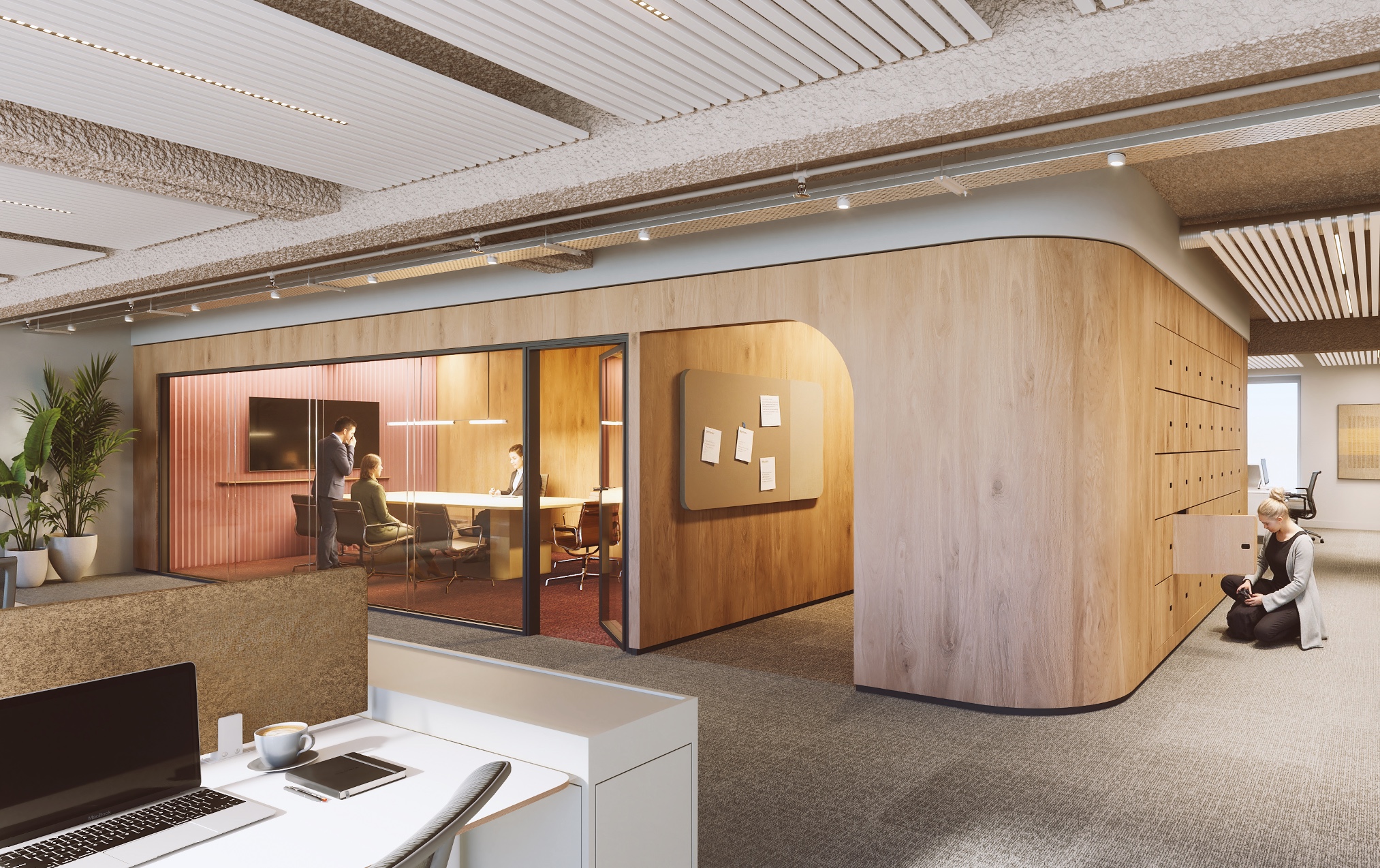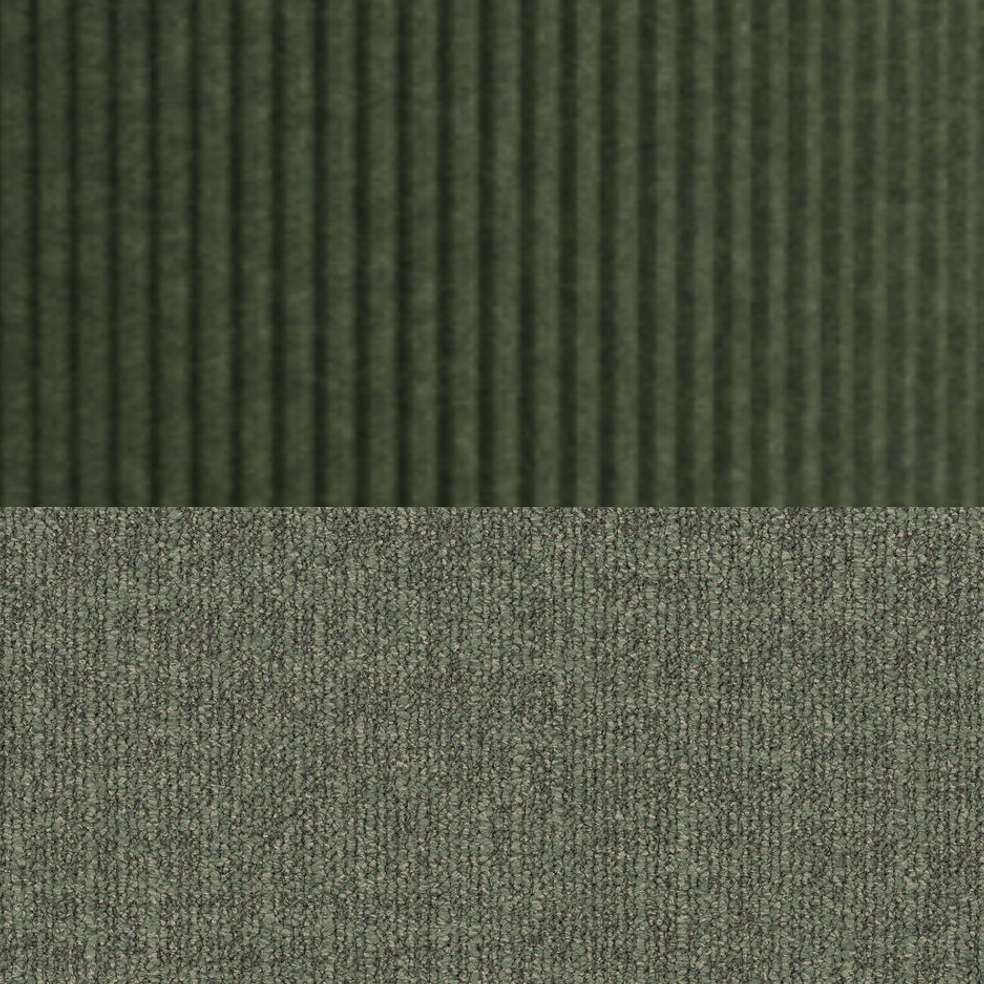 exterior shot put the space that has orange tones un this green acoustic ribbed panel and the floor in this green carpet