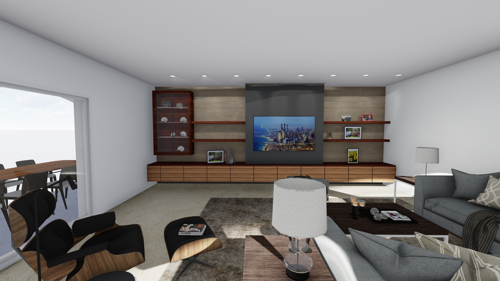 sobre esta ultima imagen generada quiero 1 los retratos de la estanterias m s grandes 2 que este todo el salon m s iluminado quiero los retratos mas grandes quiero los retratos mas grandes quiero tiras de led en la parte baja del mueble y tiras de led debajo de las estanterias quiero las lamparas iluminadas quiero que los circulos del techo sean focos puntuales sobre esta ultima imagen quiero los siguientes cambios 1 el ambiente exterior diurno 2 la pared del fondo papel pintado con aspecto de cemento quiero retratos mas grandes en las estanterias de tama o 30 cm x 40 cm en vertical quiero que la pared del fondo en las que se apoyan las estanterias este mas iluminada