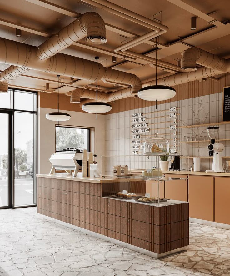 exterior shot move the coffee machine on the left the floor is beige concrete