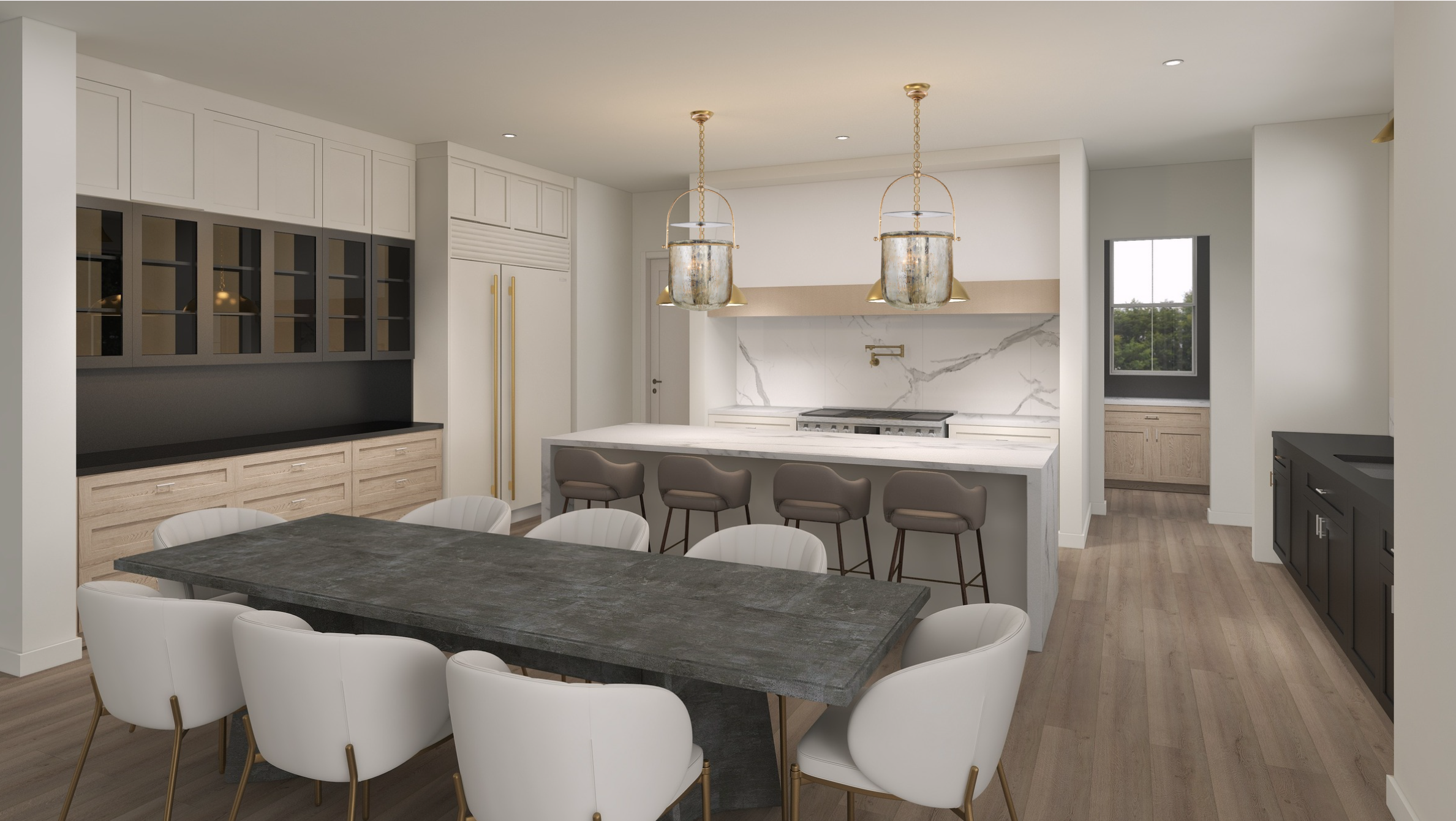 maintain all geometry create a hyper realistic interior rendering in the morning this is a first floor room the window are facing west so the view out of the window should reflect that the painted casework should be a semi gloss finish the wood casework should remain as wood with a gloss finish the light fixtures should be lit in a 2700k temperature and a soft glow the ceiling should be a matt paint finish the fixtures on the ceiling are 4 round can lights with brass housings with soft light coming from them the black upper cabinet on the left side are metal frame with fluted glass add palmetto palm branches in a clear glass vase on the dining table