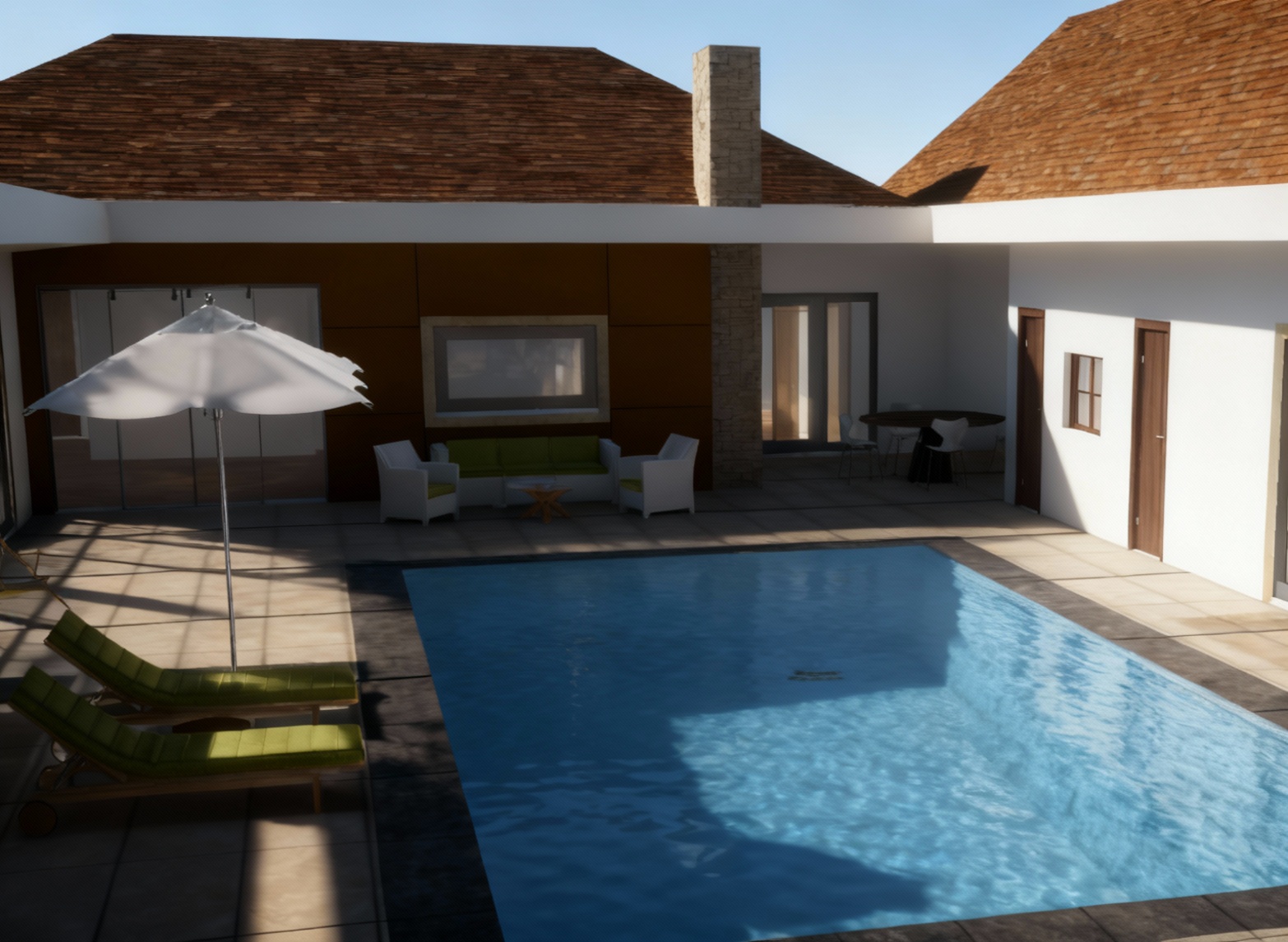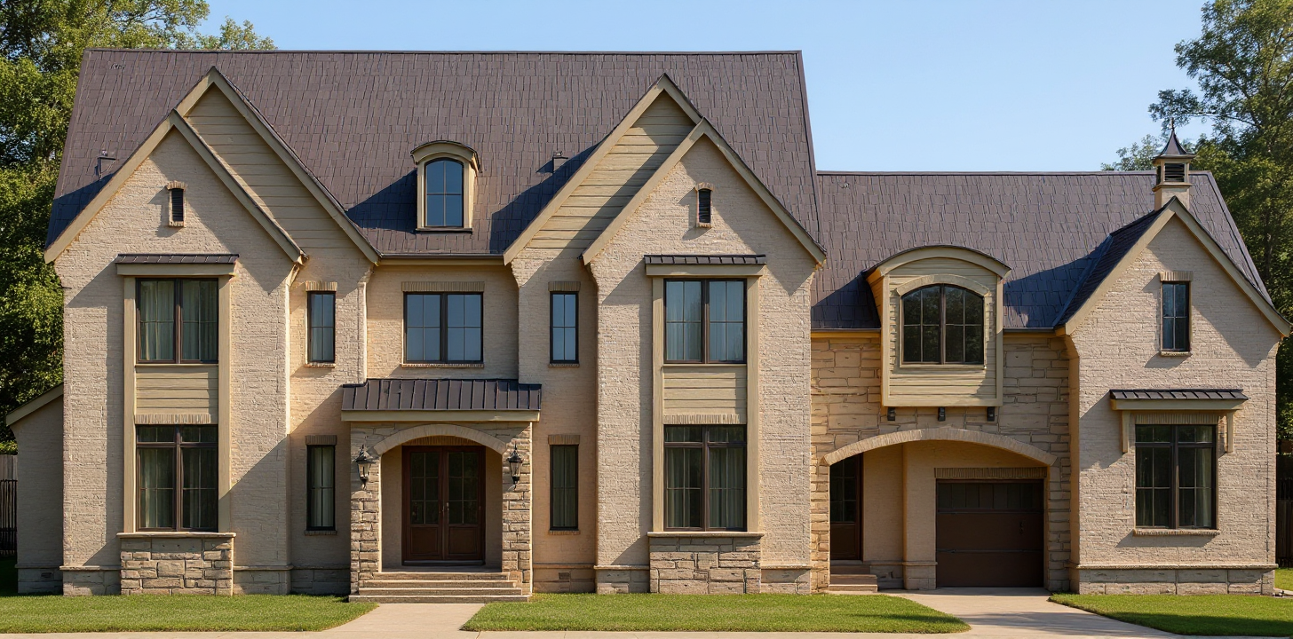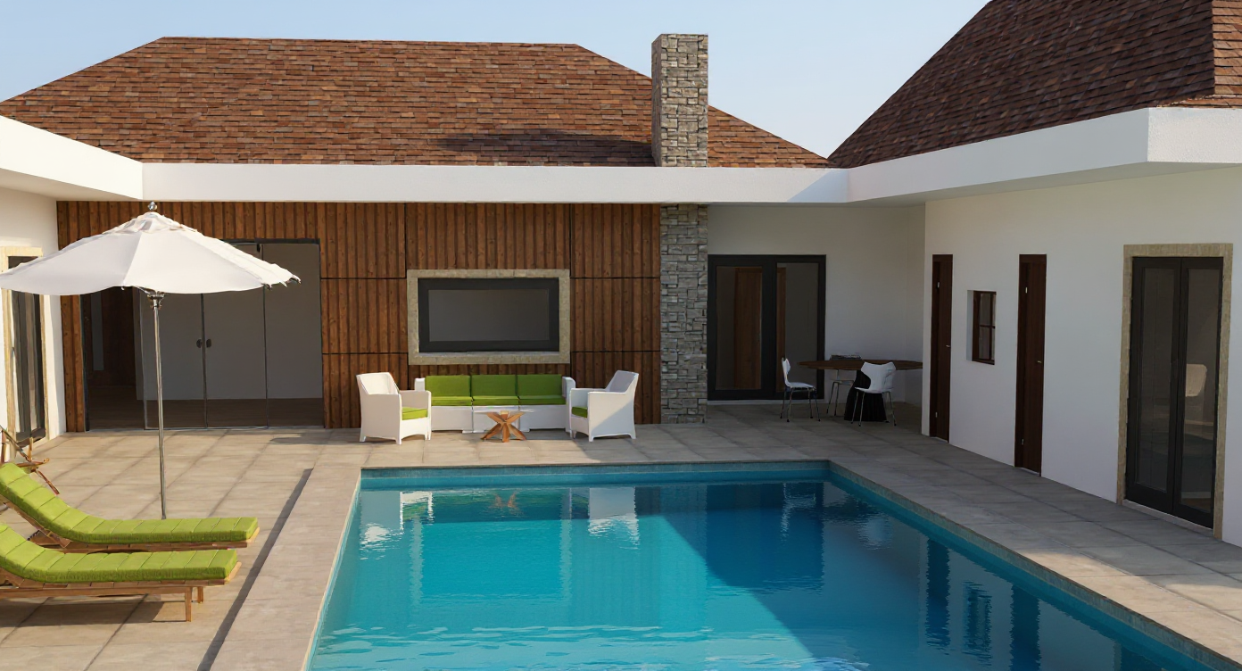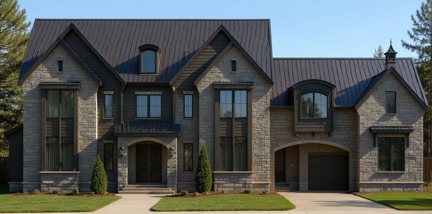 please render this image to be a realistic 3d perspective make it feel like a rustic and modern mountain lodge with great landscaping and uplighting render like it is midday with sun