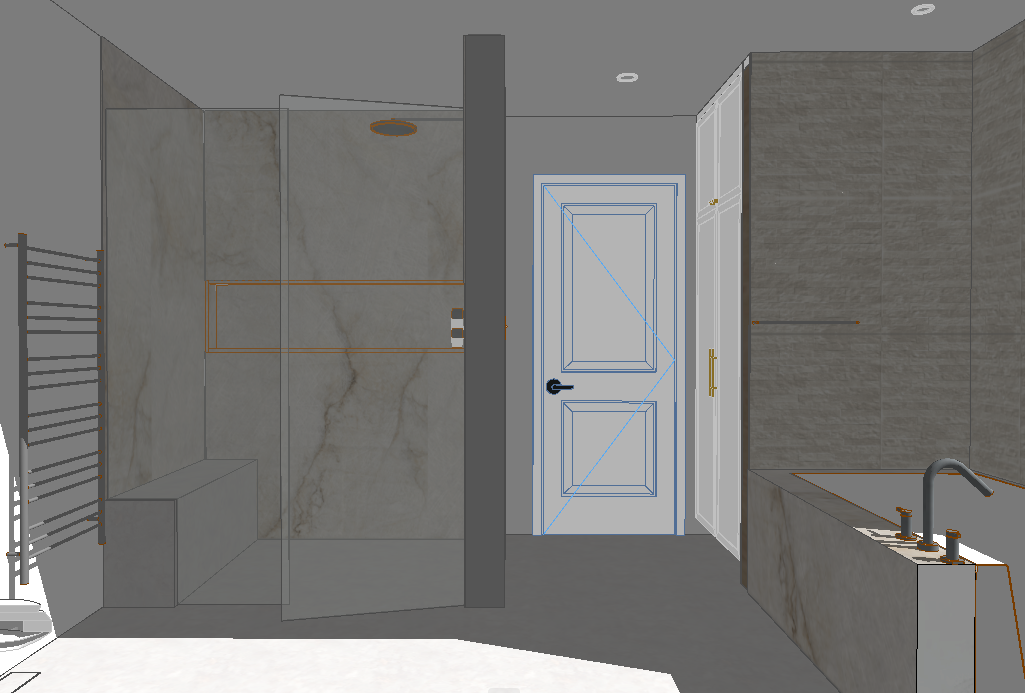luxury ensuite bathroom interior spa like atmosphere serene and elegant with a dramatic mood warm soft alabaster tall cabinetry at the doorway into the bathroom alabaster color palette textured stone wall in soft alabaster at the back of the shower niche and above the tub surround calacatta gold white marble on all other shower walls with bold elegant veining soft cream floor tile with refined matte finish brushed champagne bronze fixtures layered warm lighting subtle recessed ceiling lights moody evening lighting cinematic shadows rich contrast clean lines calming yet sophisticated composition high end interior design photography magazine ready editorial composition ultra realistic highly detailed materials luxurious textures architectural digest style 8k render