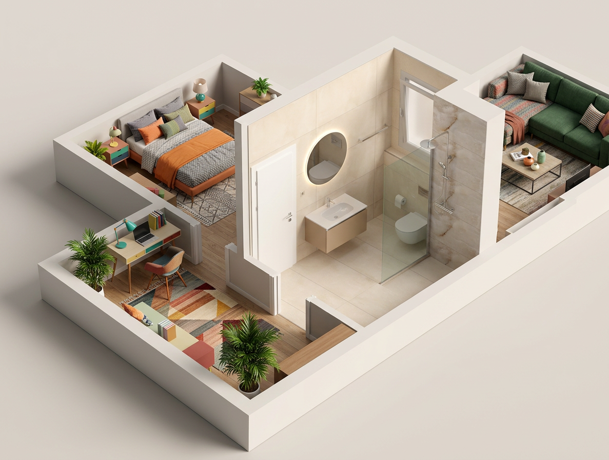 louis sullivan exterior shot render a charming modern farmhouse with a welcoming atmosphere the house features smartly designed color and material blocking using light brick dark blue hardie exterior paneling and wood panel accents large windows with dark gray roof the front porch has detailed railings and a warm wooden door the surrounding landscape includes lush green grass vibrant flower beds in shades of lavender pink and yellow and tall green trees that frame the property the sky is a clear blue with a soft golden glow from a setting sun casting gentle shadows on the house overall the scene should feel serene and inviting architecture