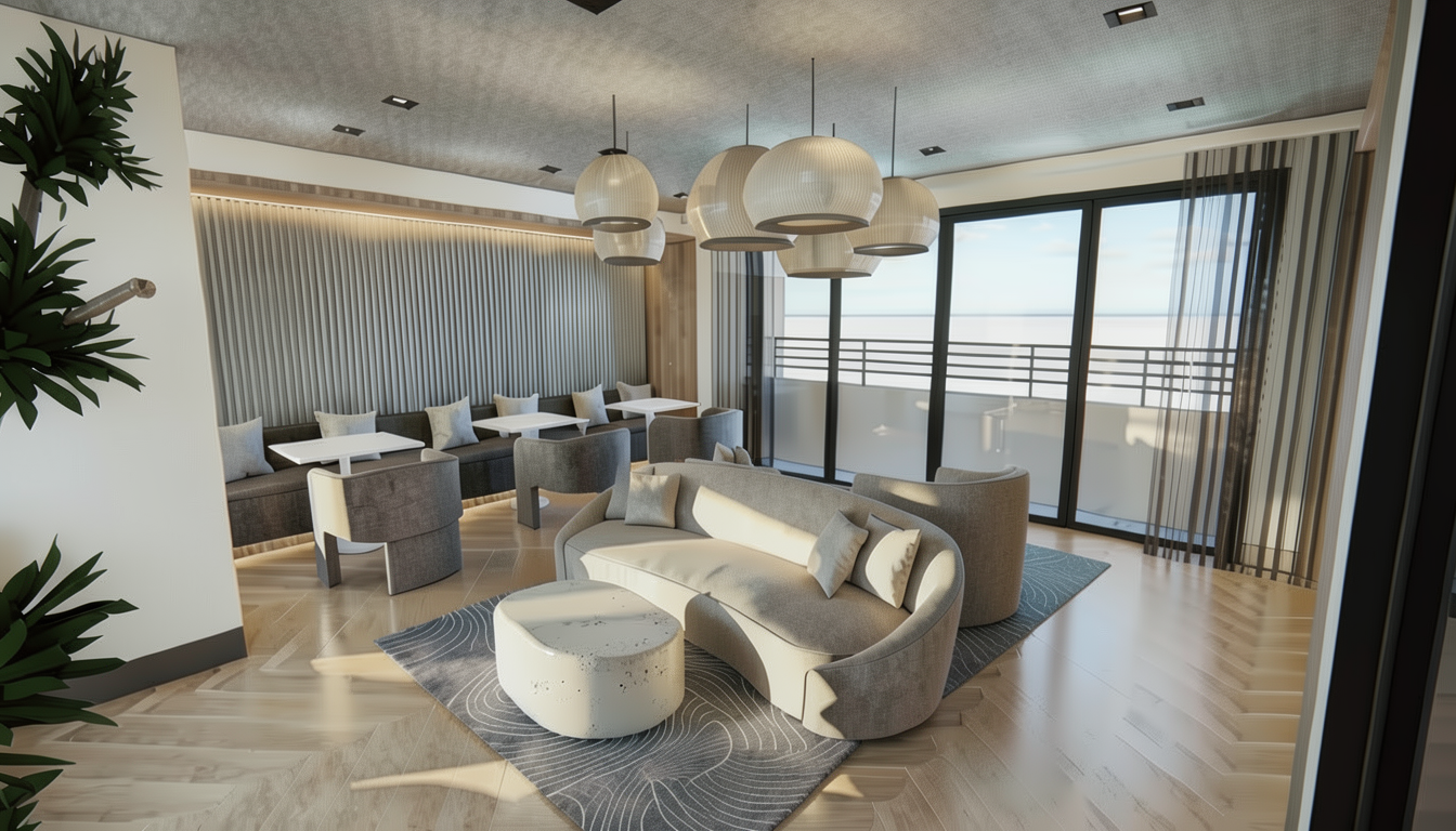 the walls are lightly plastered the lower cabinets are in stainless steel the floors are in ancient wood put spots between the beams the wall lights are in alabaster the appartment is on the fourth floor of a parisian building the wooden beams should be in the same color as the walls the cabinets with columns on the right are in walnut style like colin king