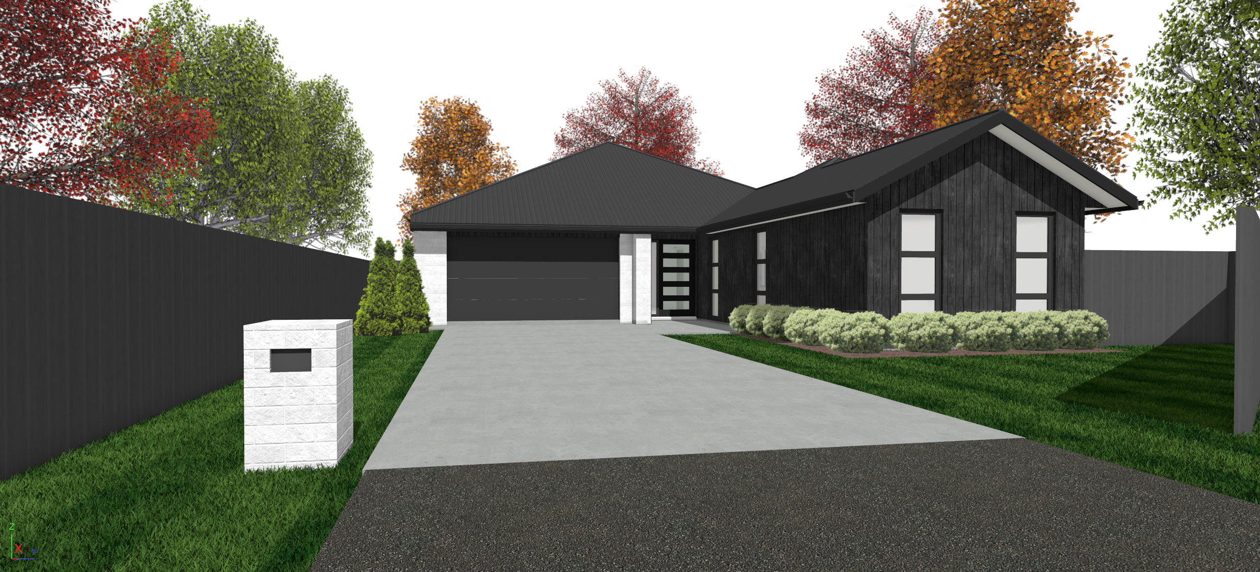 white brick black wood with a concrete driveway and fencing short grass halswell new zealand