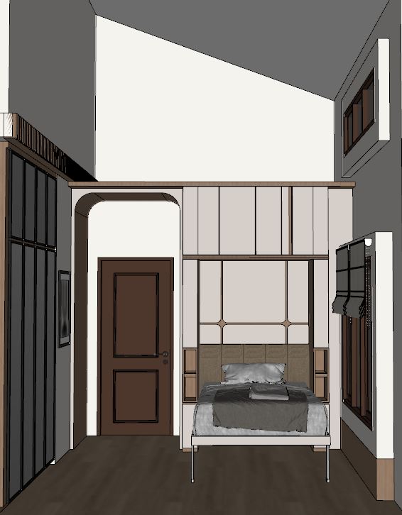 create ultra realistic images without changing any structure shape design or materials do not resize jpegs add indirect light to every shelves use mirror with black stainless frame for the wardrobe left part and add ceiling lights also add outdoor light from the window and use soft wood texture for the floor do not change color size and shape and add indirect light to headboard the ceiling is white and the wall is warm off white