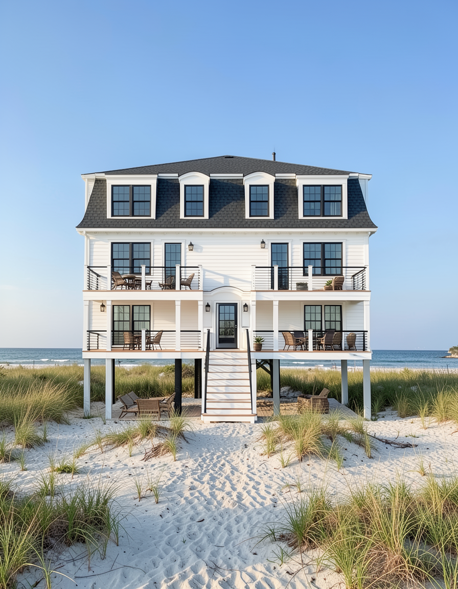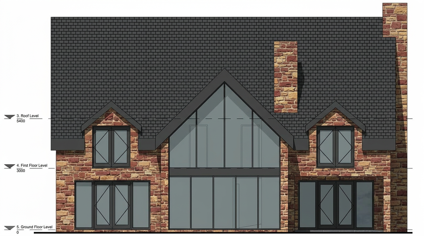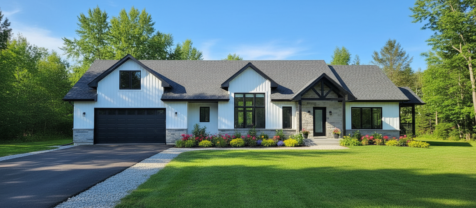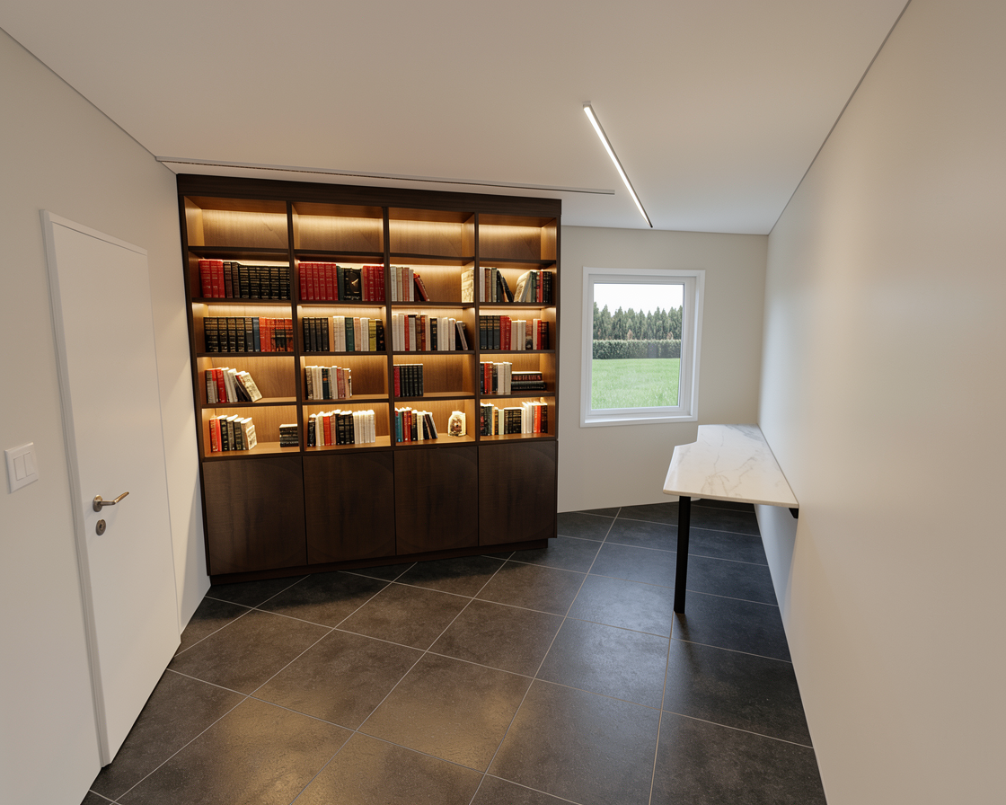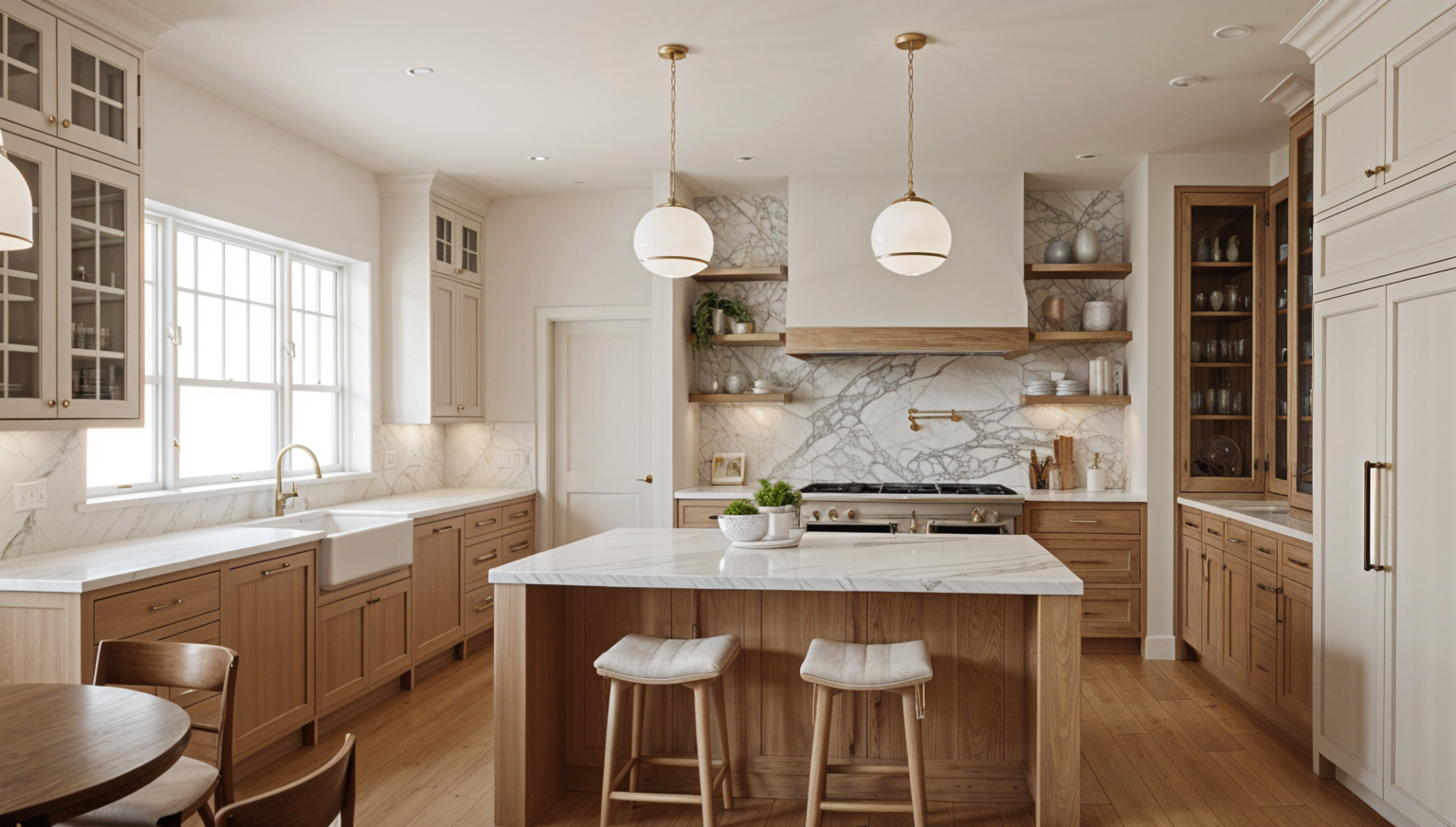 modern open plan kitchen and dining interior viewed from inside scandinavian minimalist design maintain exact geometry camera perspective and architectural layout no modifications to kitchen walls staircase windows ceiling or built in elements preserve all proportions and spatial relationships maintain strict color and material fidelity super matte off white kitchen fronts natural cherry wood semi matte oiled finish accents light oak flooring white marble countertop with subtle gray veining and black details do not alter hue saturation or contrast of base materials introduce a gently warmer soft natural lighting atmosphere consistent with late afternoon daylight entering from the right side windows ensure realistic light falloff and soft shadow gradients avoid dramatic contrast or stylization add curtains to the windows light high quality fabric e g sheer linen or soft textile in neutral tones like off white or light beige curtains should hang naturally and realistically slightly diffusing incoming daylight place curtains on all window elements except in the area between the kitchen run and the island keep that zone clean and unobstructed generate a realistic outdoor environment visible through the windows a calm natural garden or meadow setting with grass subtle vegetation and soft depth lighting of the exterior must match the warm late afternoon mood and integrate naturally with the interior lighting avoid overly saturated greenery or artificial appearance enhance photorealism with refined global illumination accurate reflections especially on glass surfaces and appliances and high quality material textures with subtle micro detail subtly decorate the kitchen while maintaining a clean high end aesthetic include minimal accessories such as a ceramic bowl or fruit on the island a wooden cutting board a neutral toned linen cloth and a small plant or herbs keep composition balanced and uncluttered ensure visual consistency with the previous perspective in lighting temperature mood and styling no structural or design alterations only atmospheric enhancement exterior integration and tasteful staging