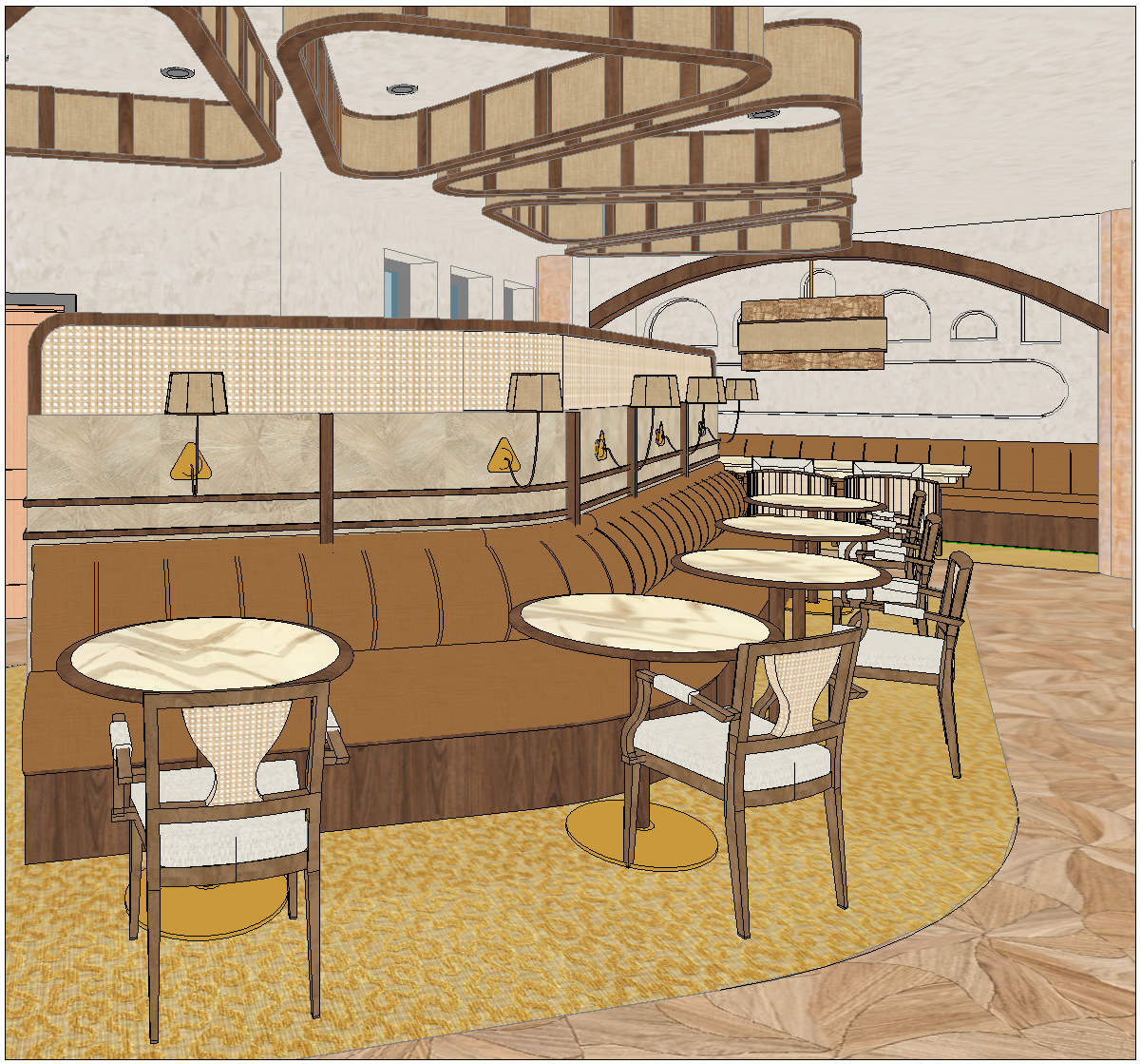 transform the provided restaurant interior image into a high end photorealistic render of a french mediterranean restaurant with warm golden hour atmosphere soft glowing highlights and relaxed upscale coastal energy while keeping everything exactly the same same proportions same booth seating same ceiling elements same wall finishes same materials and same spatial configuration do not move or alter any objects geometry textures colors or furniture positions the chairs throughout the restaurant must remain exactly in the same locations and proportions but their materials should read realistically while keeping their shapes frames and positions unchanged add premium table settings elegant plates cutlery and cloth napkins while keeping all tables and chairs in their exact positions keep the wood flooring material the same add some small coastal mediterranean style lamps on the tabletops that match the color scheme make all of the lamps different on each table to add some variation include modern young guests seated at the bar and at selected tables casually social correctly scaled tastefully integrated without crowding or obstructing architectural details lighting should emphasize golden hour warmth gentle reflections soft shadows enhanced color richness and luxurious catalog level realism improve depth and realism through wood grain richness marble shine brass highlights fabric texture and polished clarity while keeping the entire scene exactly as originally designed add some mediterranean pottery that is warm in color on the far back wall where the curved shelving is keep the yellow carpet and its design the same as it is depicted in the image keep the wood flooring pattern and colors the same as it is depicted in the image keep the materials on the lamps on the wall the same backlight the pottery displayed on the back wall slightly but don t make it too dramatic