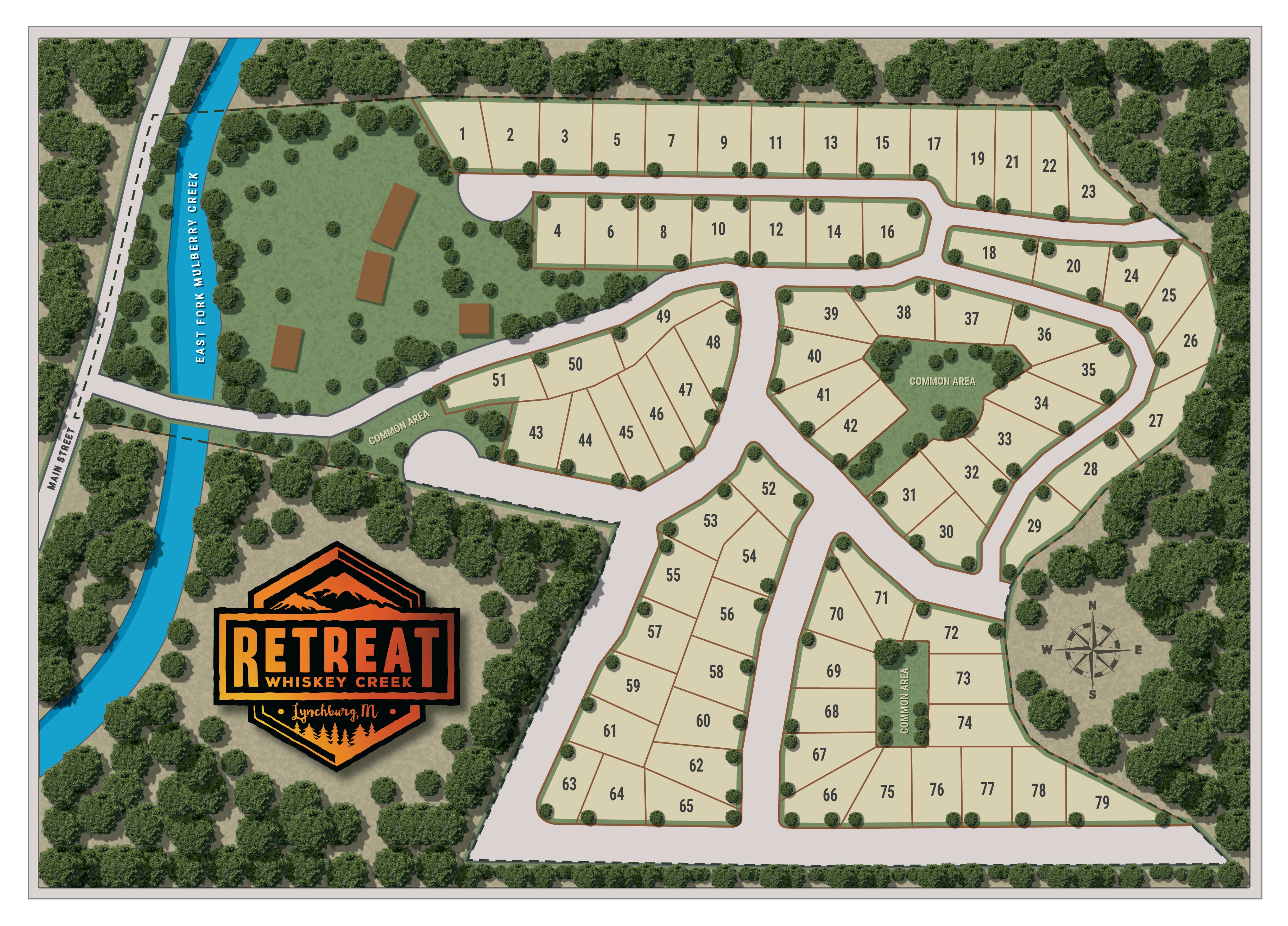 i want to show a realistic view of what the retreat at whiskey creek will look like once homes are built can you take this layout and incorporate earthtone tiny homes with variations that have covered porches decks firepits and hot tubs with string lights in the trees