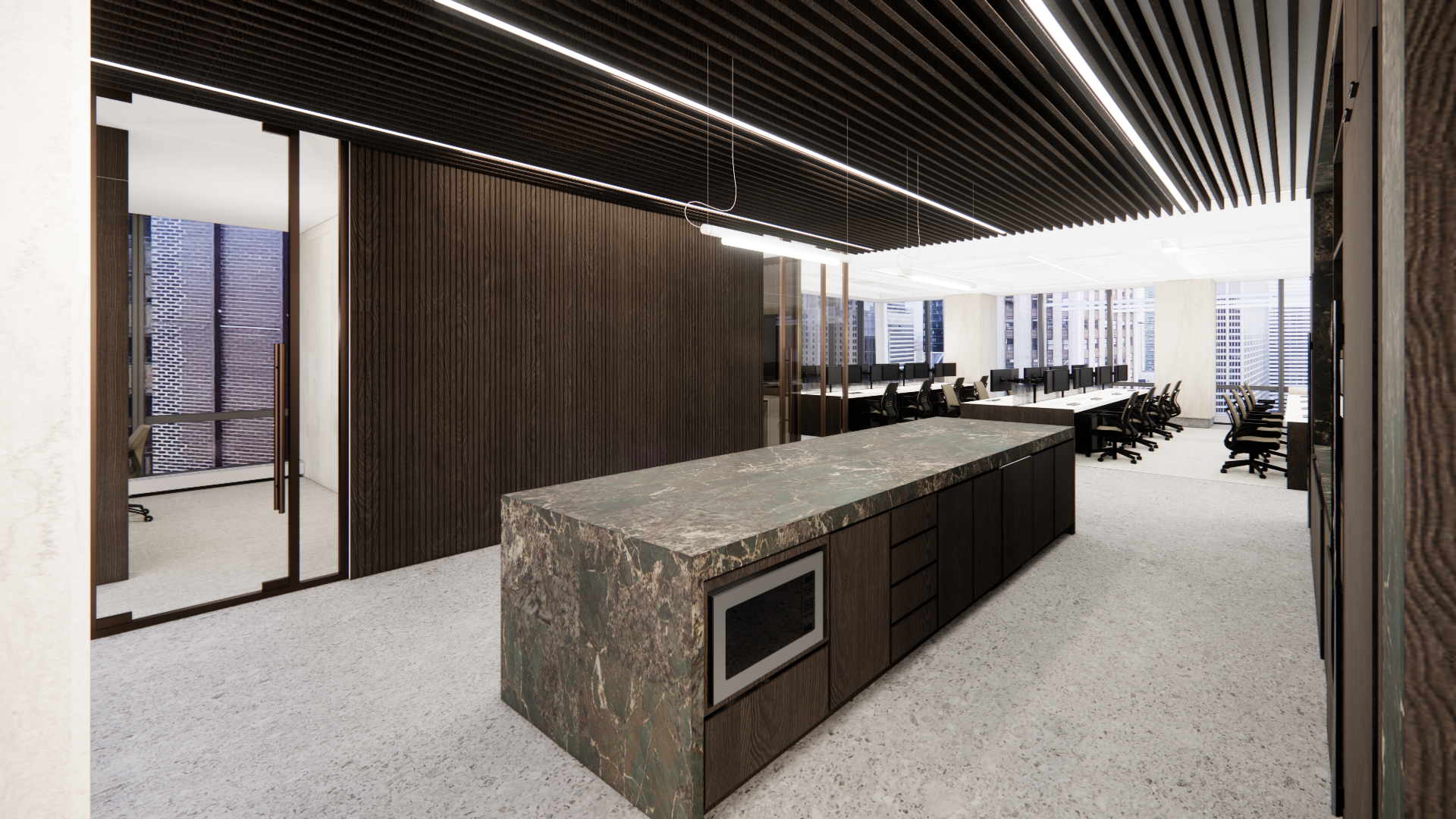 provide a photorealistic rendering keep all the elements proportions and materials as they are provide daylight through the glass only add more ambient lighting to the overall interior space
